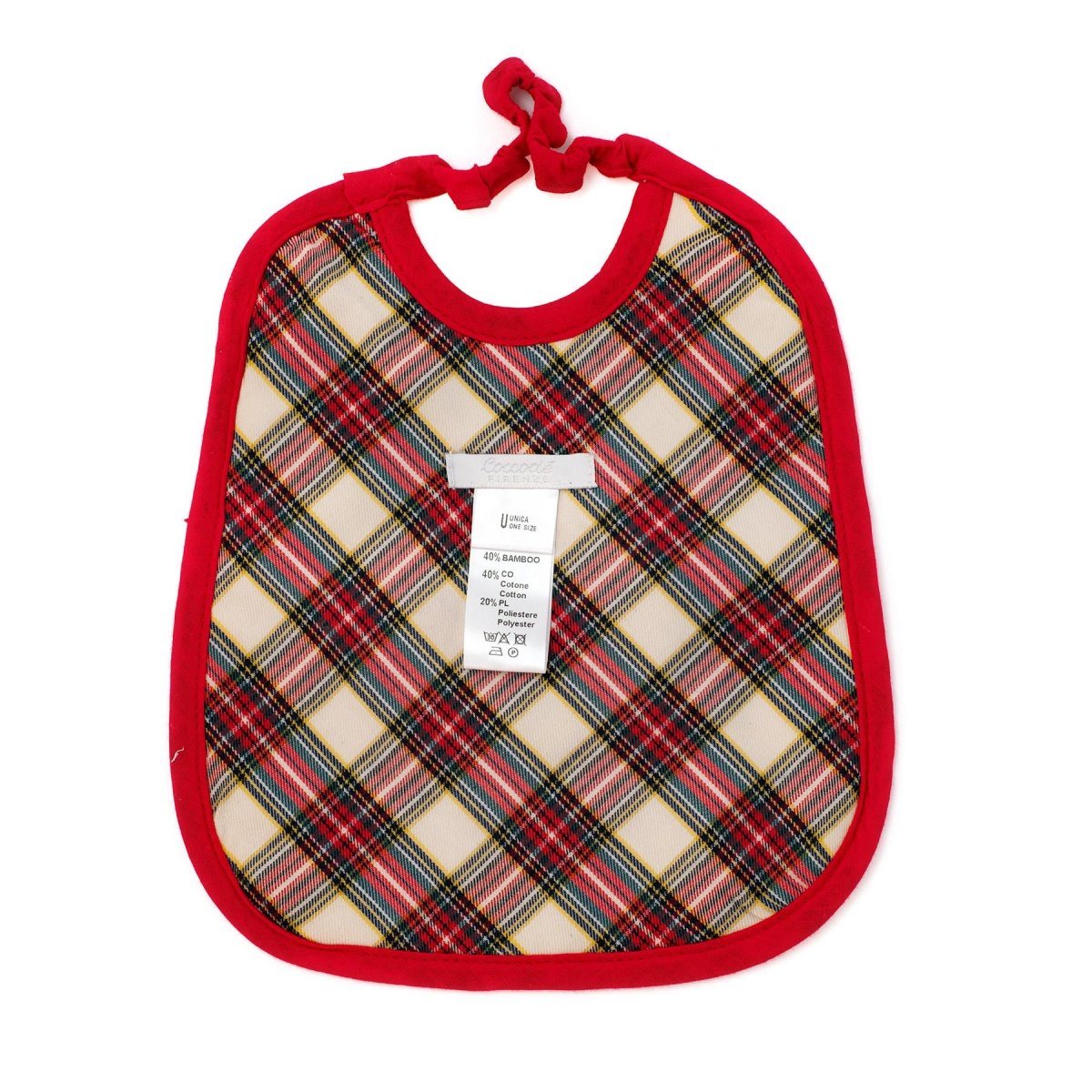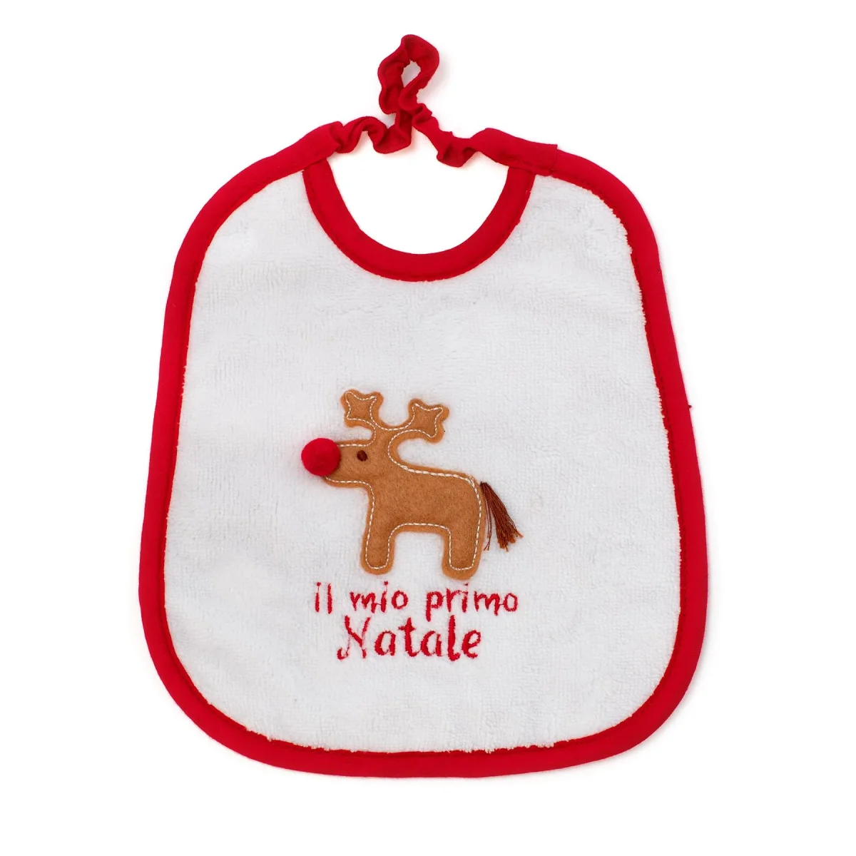 Bavetta Coccodè neonato, modello rotondo con chiusura laccio, fantasia tartan posteriore e ricamo renna e scritta il mio primo natale