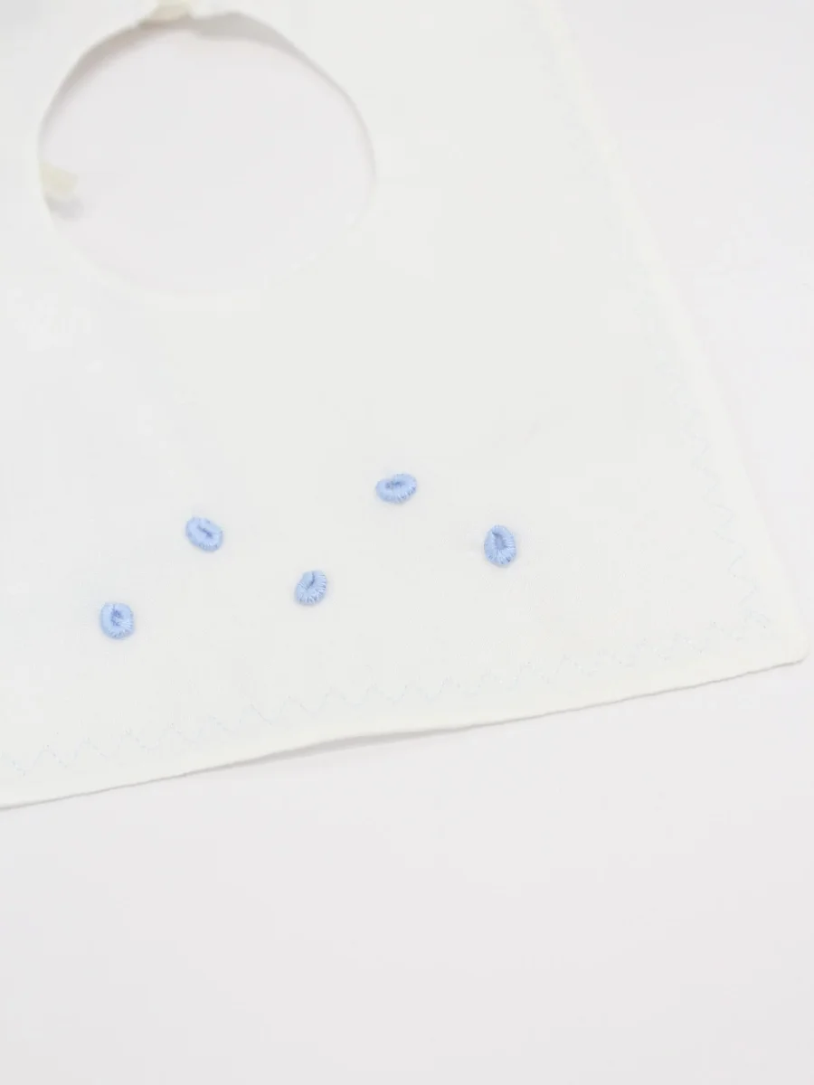 Bavetta neonato Piccola Giuggiola, modello squadrato con chiusura laccio in tono. Realizzata in cotone batista con ricami fatti mano in contrasto, colore bianco