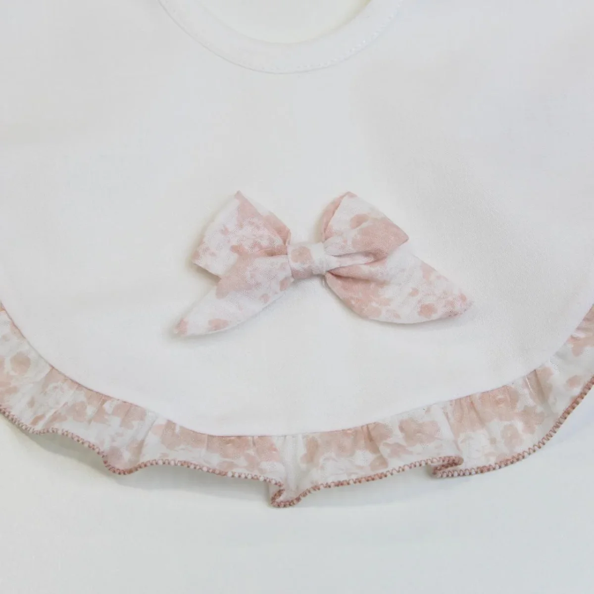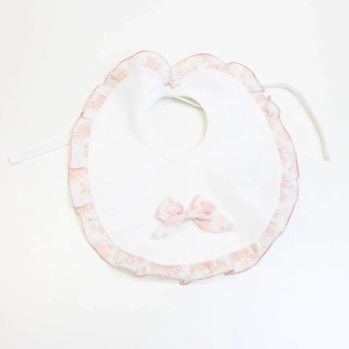 Bavetta Margot Piccola Giuggiola, in tessuto batista realizzato in lino ad armatura tela, bordo in contrasto con motivo floreale e chiusura con laccio. Dettaglio fiocco al centro.