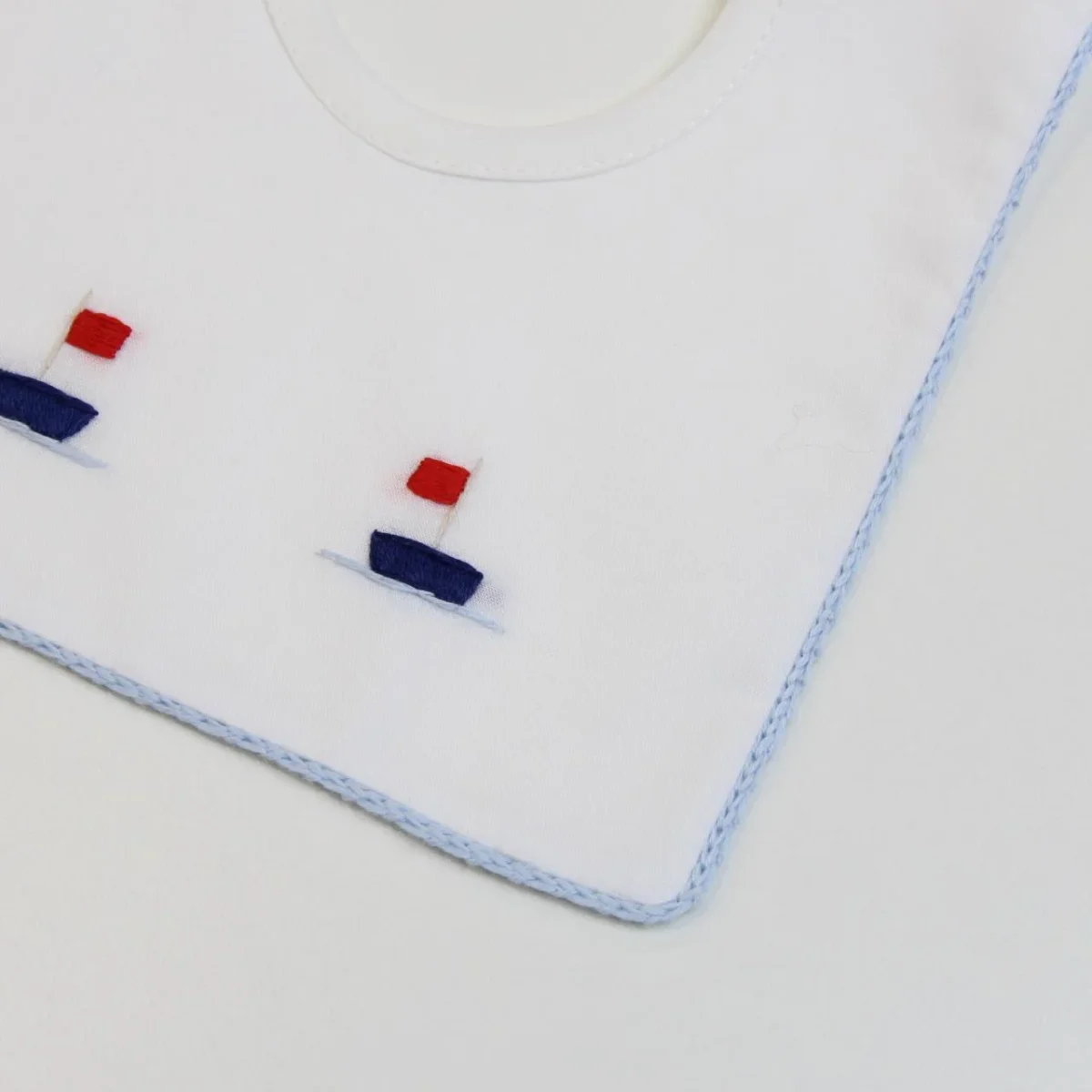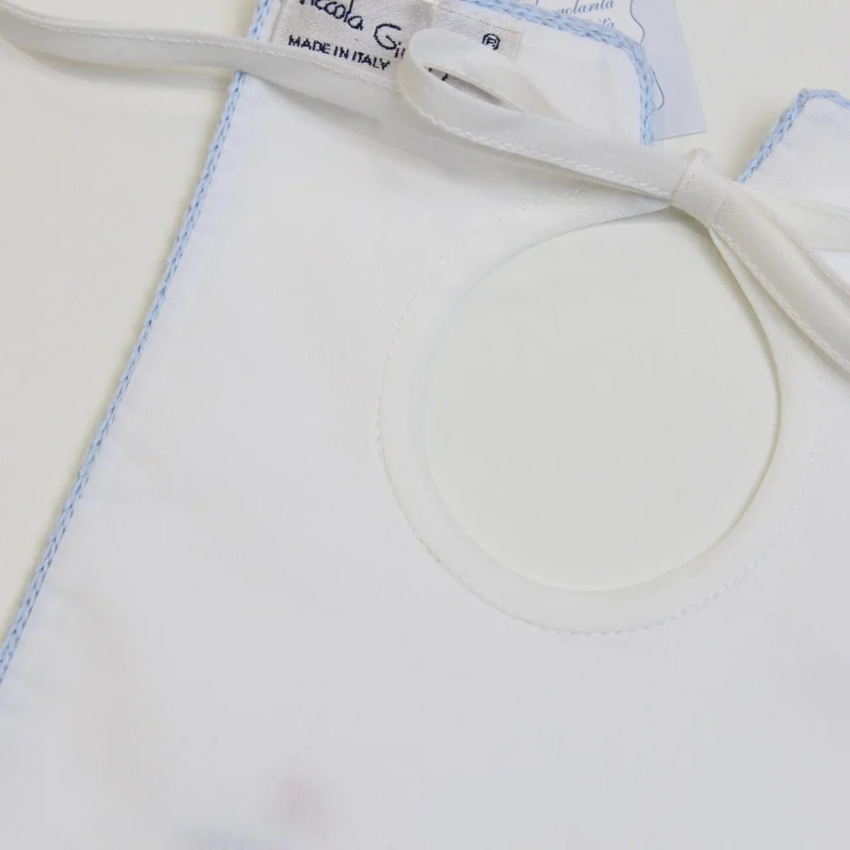 Bavetta Piccola Giuggiola in tessuto Batista, tessuto molto fine realizzato in lino ad armatura tela, chiusura posteriore e dettagli sui bordi e al centro.