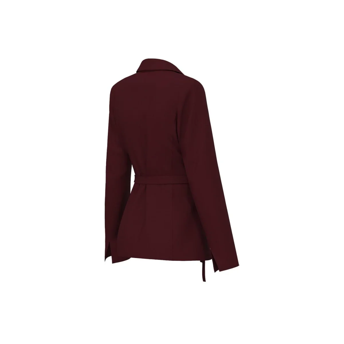 Blazer doppiopetto in flanella di misto viscosa stretch, scollo con rever a lancia,chiusura con bottoni e cintura in vita, tasche laterali con patta, color bordeaux