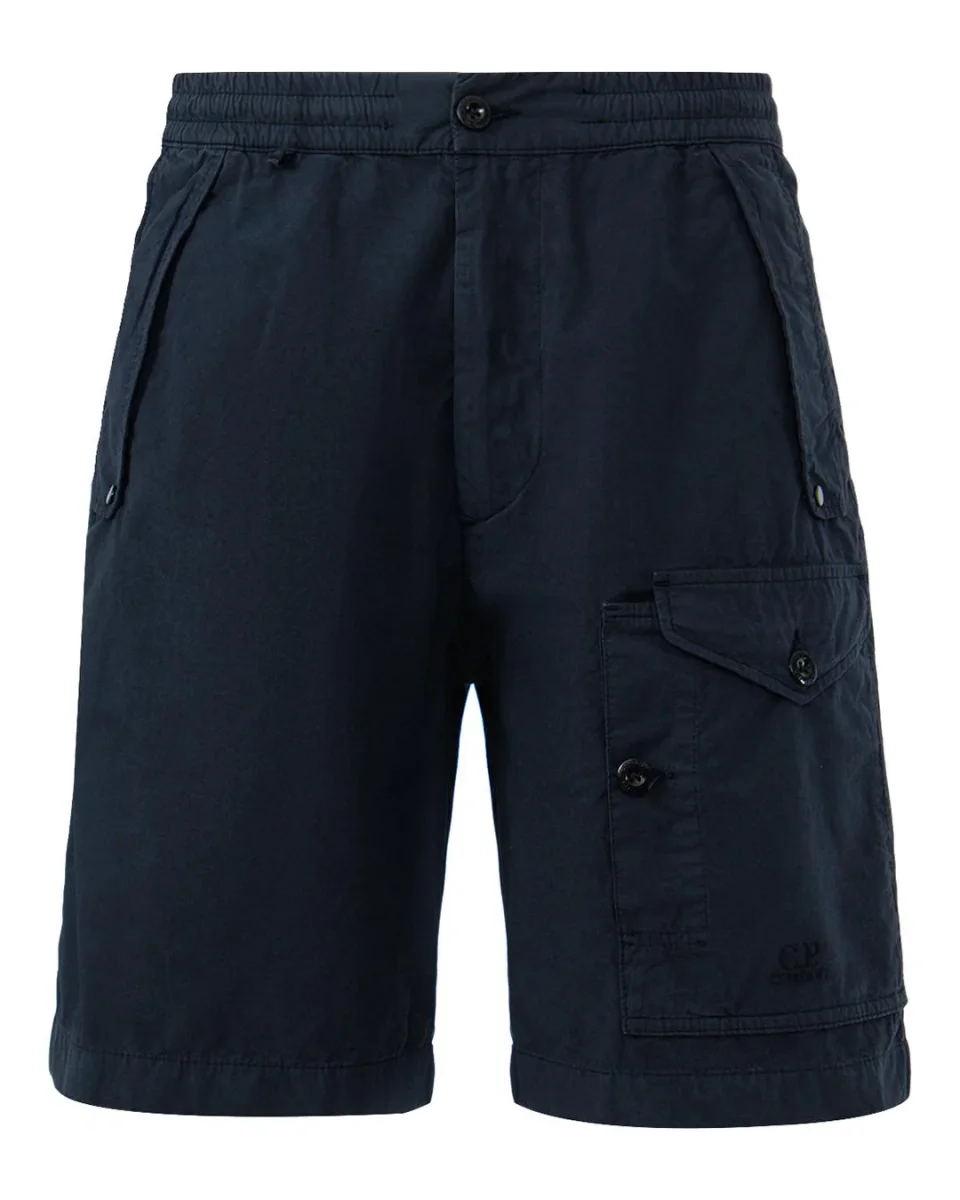 Burmuda con chiusura frontale con bottoni e zip, vita elasticizzata con coulisse interna, tasche laterali con patta, colore blu