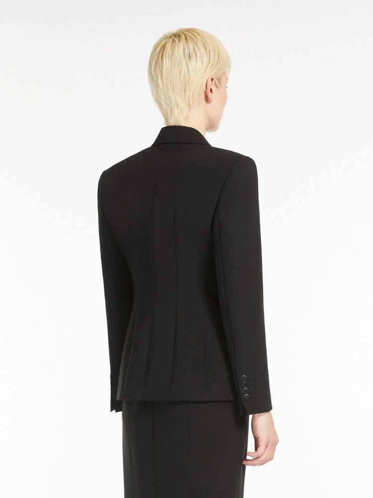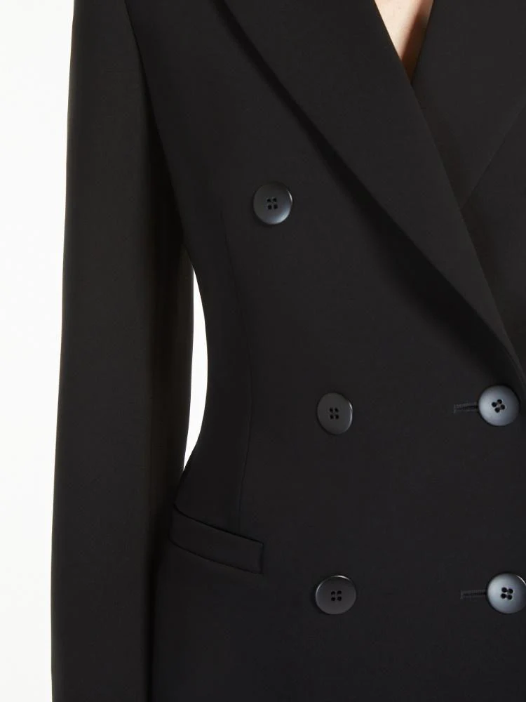 Blazer doppiopetto in cady, silhouette a clessidra con pinces cucite in vita sulla schiena, modello foderato con collo rever a lancia, maniche lunghe a giro e tasche a filetto, colore nero