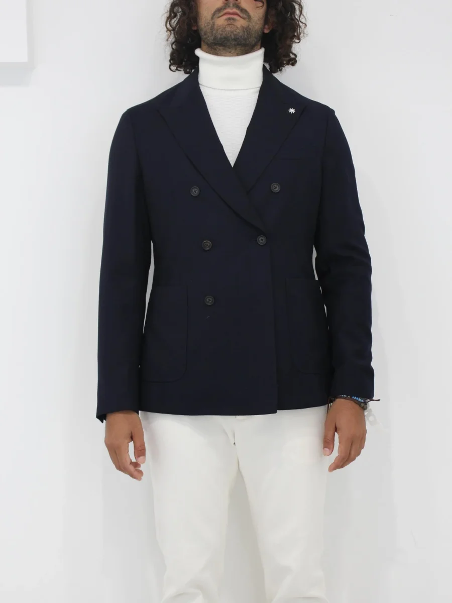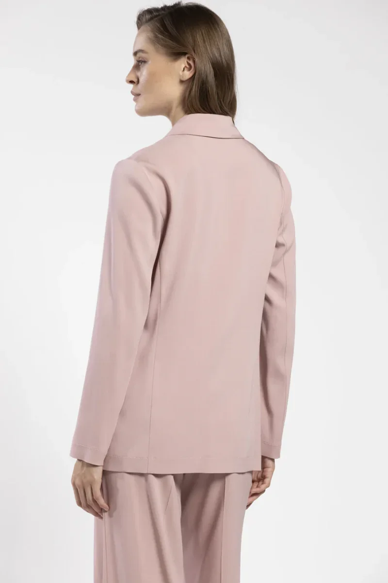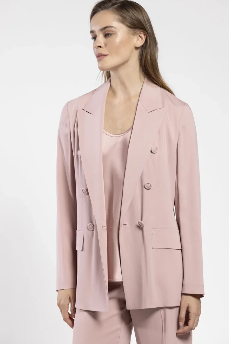 Blazer doppiopetto sfoderato in crepe viscosa elasticizzata, collo con revers e allacciatura doppiopetto con bottoni ricoperti, patte applicate effetto tasca, colore rosa