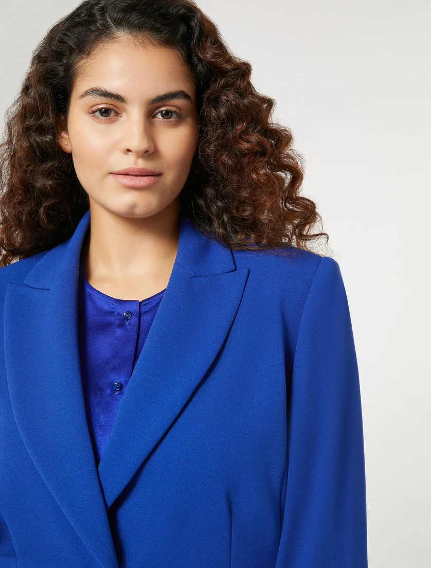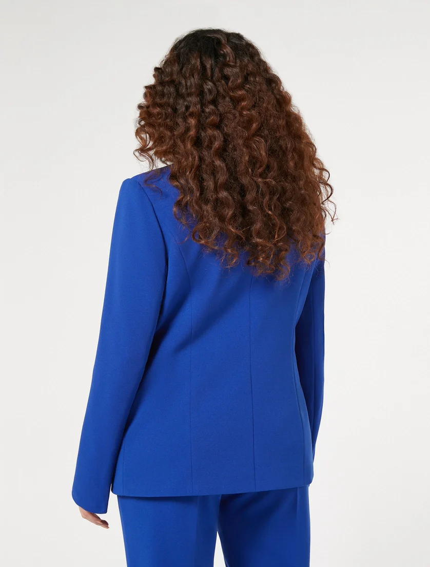 Blazer in jersey stretch Persona By Marina Rinaldi, linea aderente con collo revers a lancia, maniche lunghe, chiusura monopetto con bottone ricoperto, tasche a filetto e fodera interna stretch, colore bluette