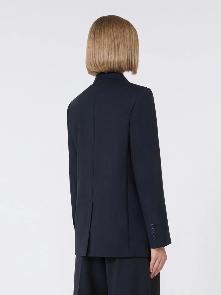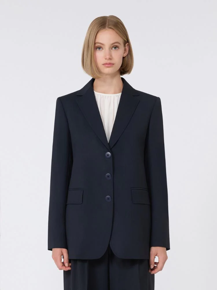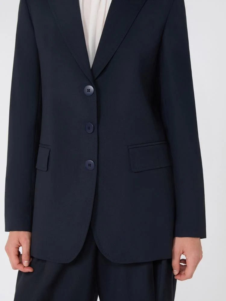Blazer in tela di lana leggera, collo a rever, maniche lunghe a giro con bottoni sui polsi, chiusura 3 bottoni a vista, tasche con patta applicata sul davanti, colore blu