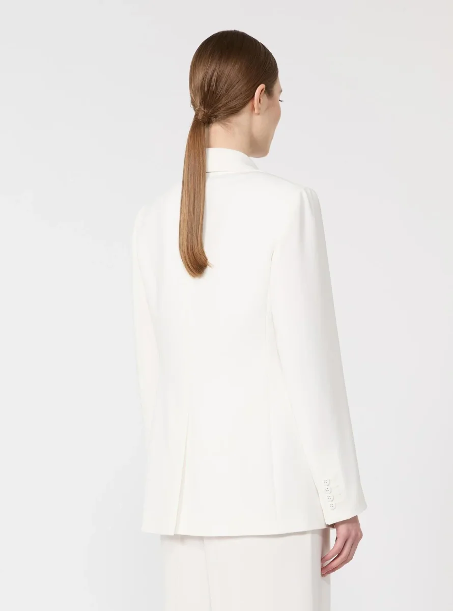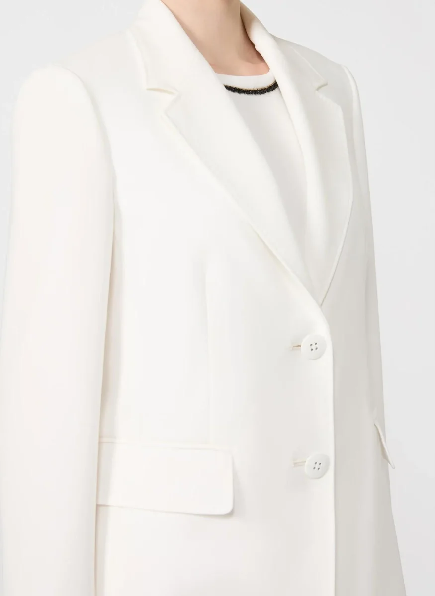 Blazer monopetto Max Mara Studio, linea allungata con spacco centrale sul retro, collo a rever, chiusura frontale, tasche a filetto, colore bianco