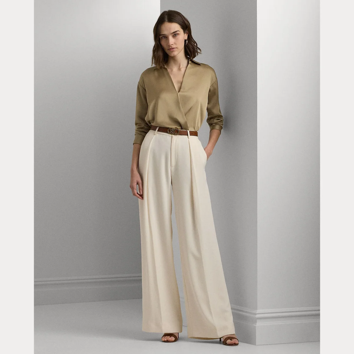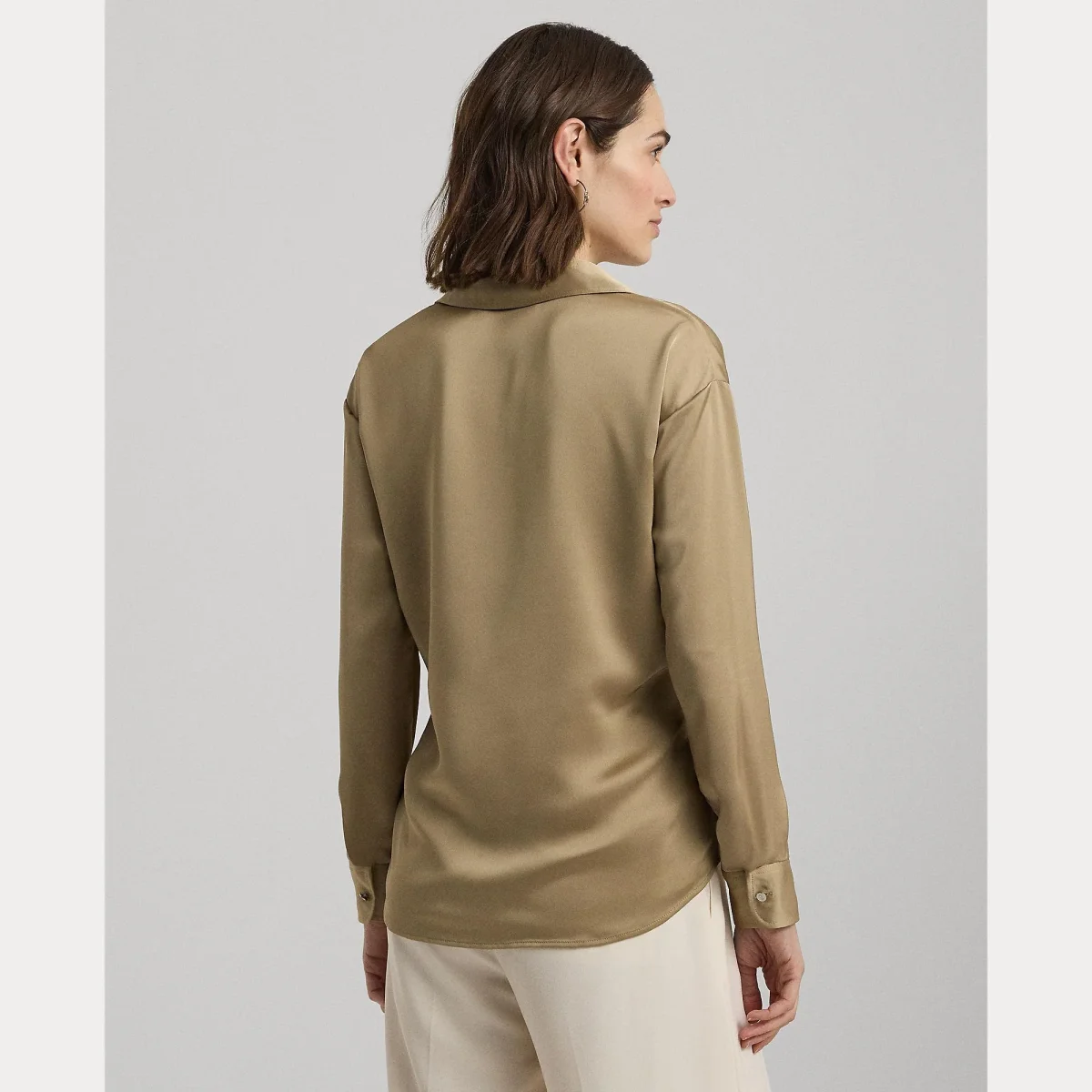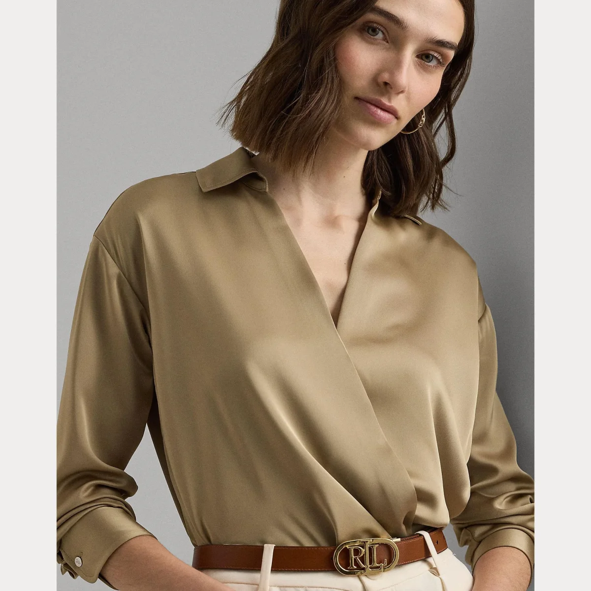 Blusa Ralph Lauren donna, modello con ampio scollo a V, realizzara in charmeuse di raso, finitura lucente, colore beige