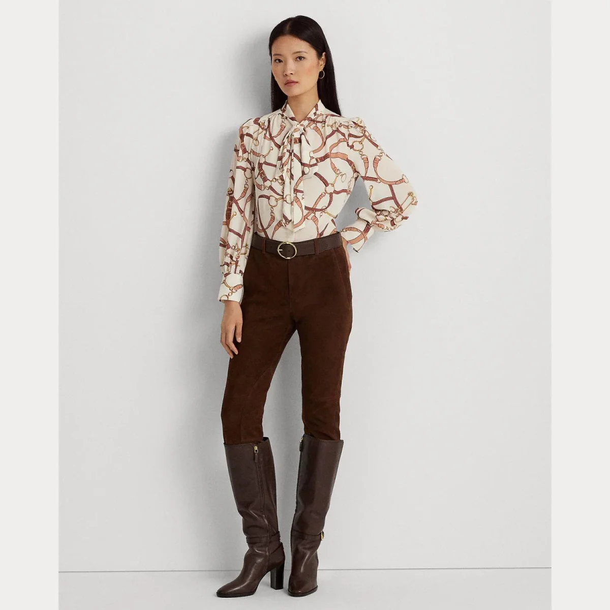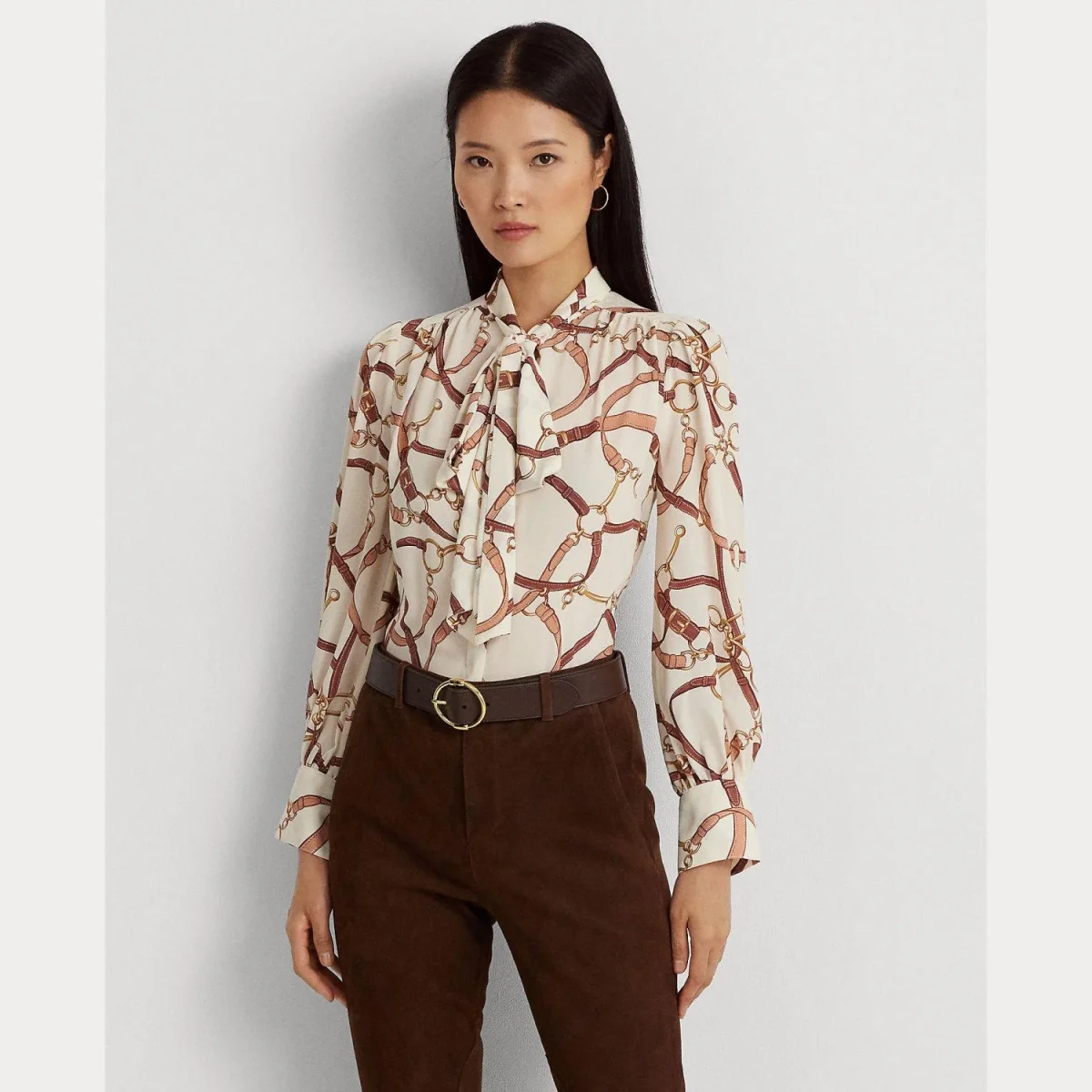Blusa Lauren Ralph Lauren, modello con fiocco sul collo, chiusura nascosta con bottoni, dettaglio con incisione, maniche lunghe blouson con polsini e bottoni a occhielli