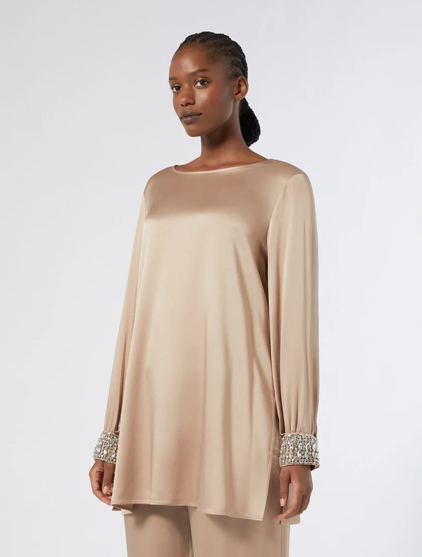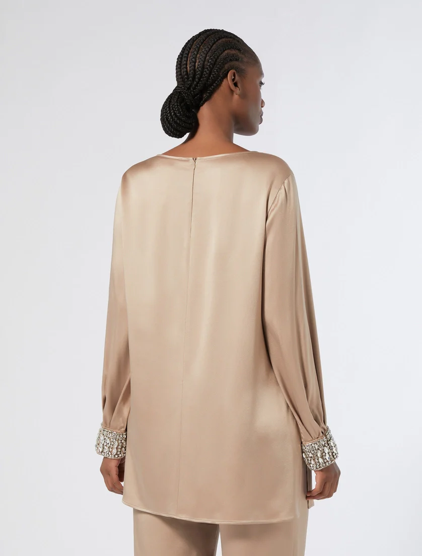 Blusa Marina Rinaldi, modello in crepe envers in satin lucido, ricamo a mano con castoni in vetro, spacchi ai fiachi e chiusura con zip invisibile sul retro, colore beige