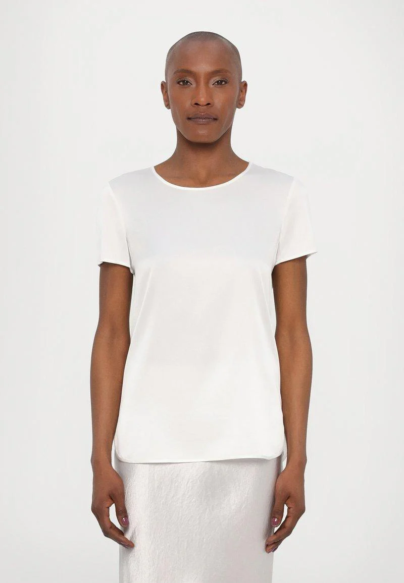 Blusa in crepe de chine di pura seta, linea dritta, girocollo arricciato, chiusura a goccia con bototne sul retro, colore bianco