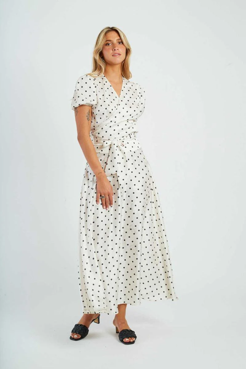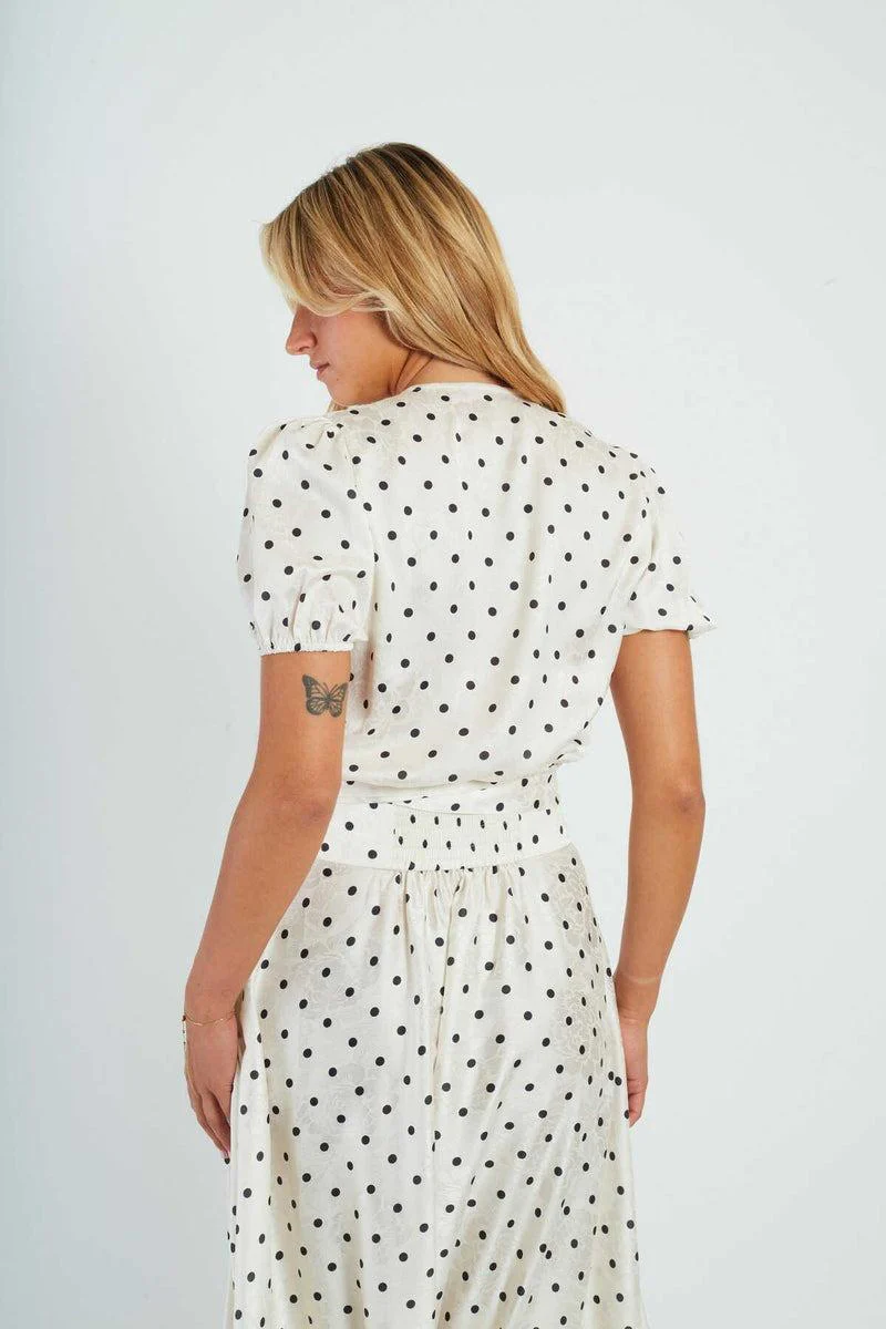Blusa in raso Derhy, modello corto in tessuto satinato con motivo a pois, maniche corte e cintura da annodare, colore bianco