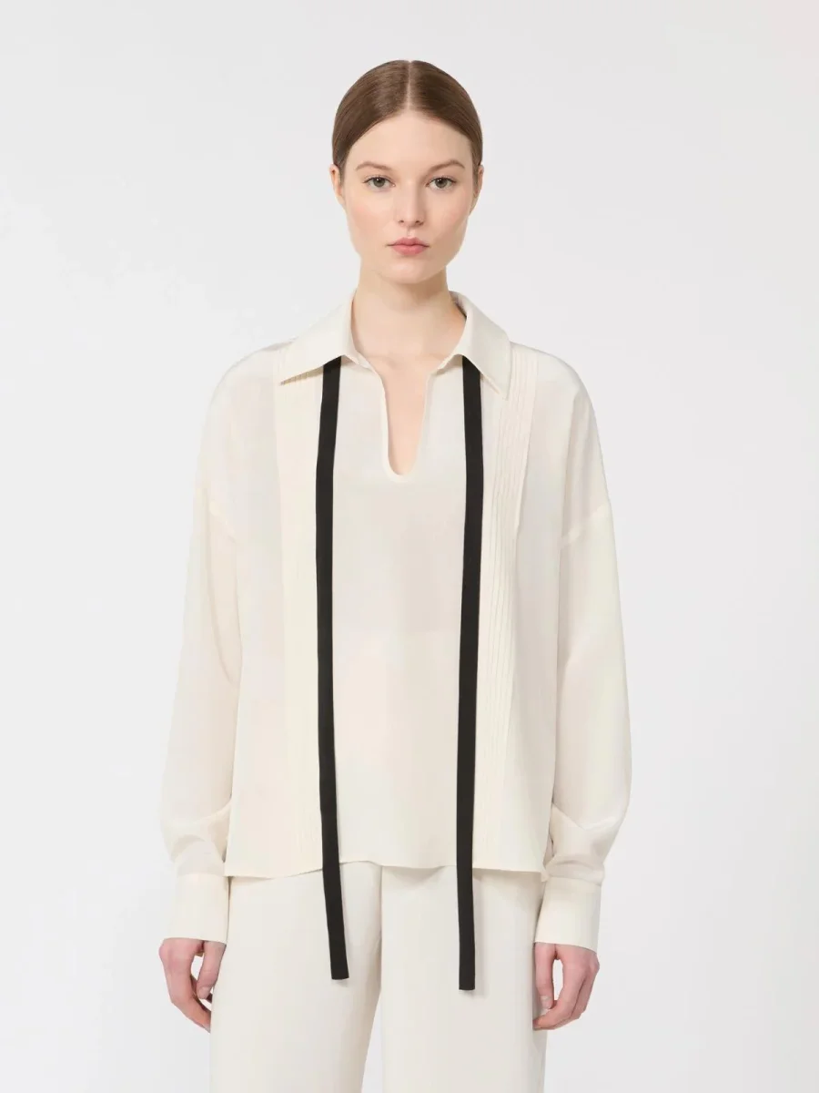 Blusa Max Mara Studio, modello in pura seta, colletto a camicia con scollo a goccia, maniche lunghe a giro basso, motivo con nervature sul davanti, colore bianco