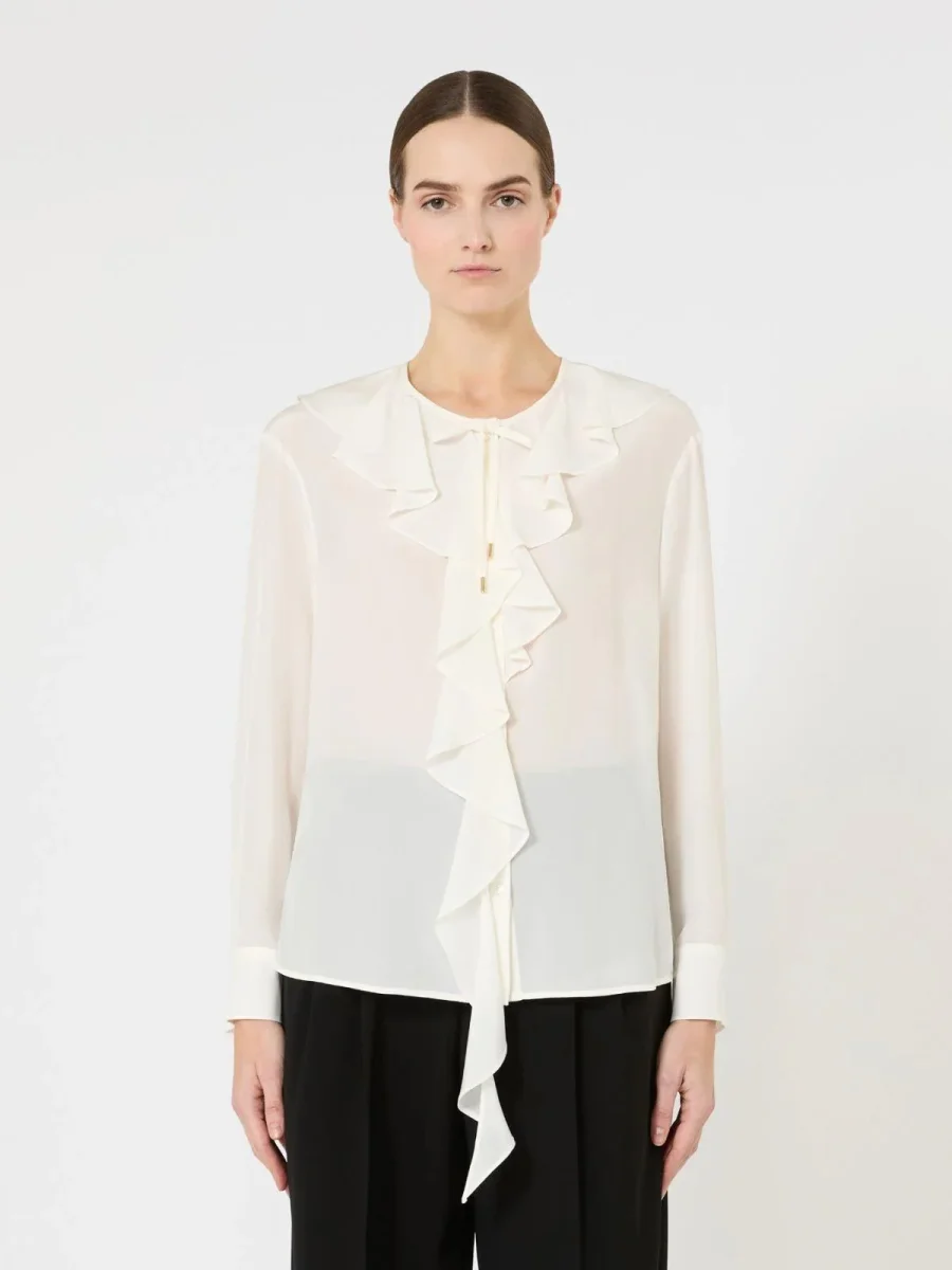 Blusa in crepe de chine di pura seta, girocollo con laccetti da annodare, maniche a giro con polsino a camicia e bottone a gemello, chiusura frontale con bottoni a vista, colore bianco