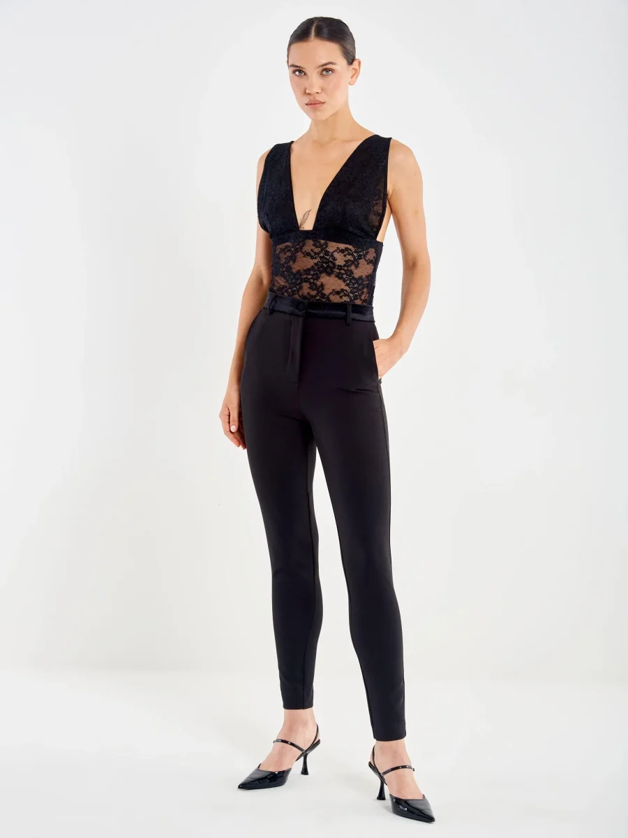 Body in pizzo con scollo a V profondo, chiusura sul fondo, colore nero