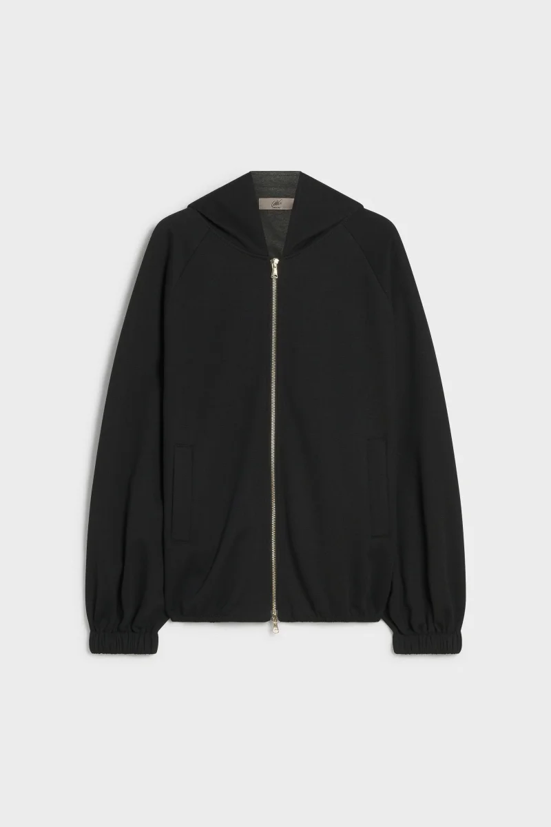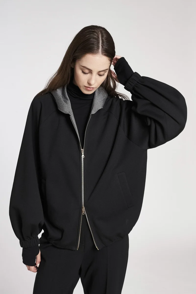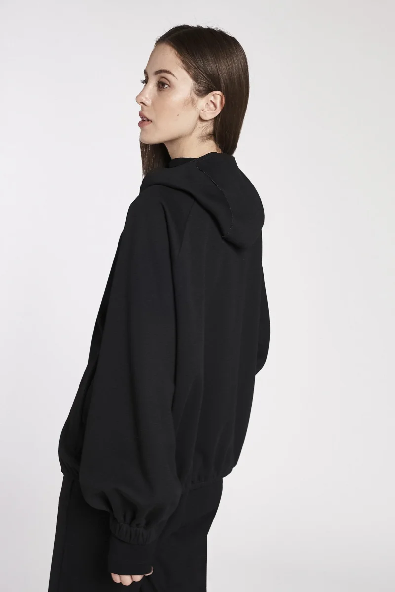 Bomber sfoderato in tessuto scuba doubleface, cappuccio e allacciatura frontale con lampo di metallo e tasche a filetto, ampie maniche con elastico al fondo, colore nero