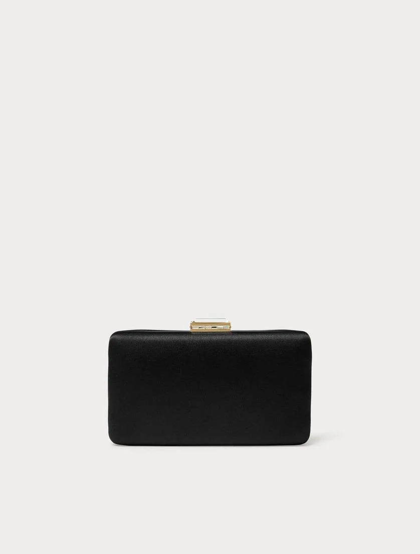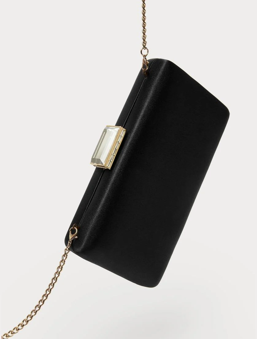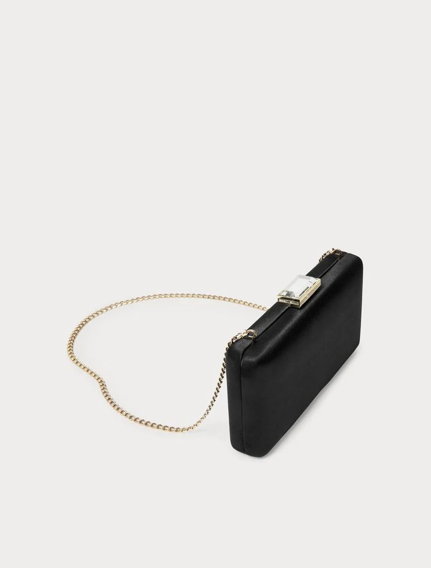 Borsa clutch rettangolare, realizzata in raso con chiusura gioiello, finiture in metallo e tracolla rimovibile in catena, colore nero