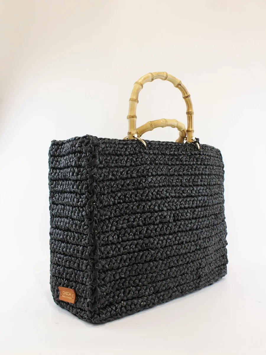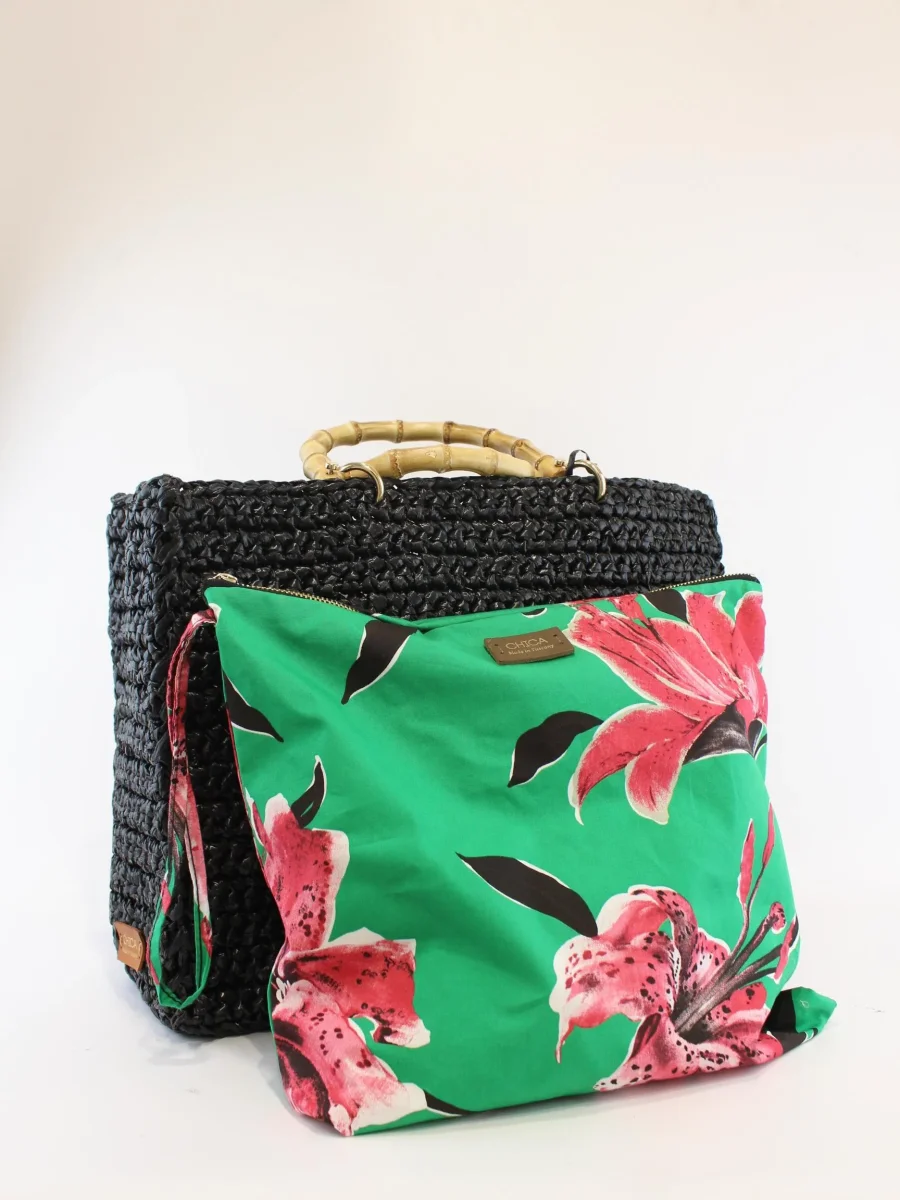 Borsa shopping grande Chica Bag, realizzata all’uncinetto con manici bambù e pochette interna a fantasia in tessuto, colore nero