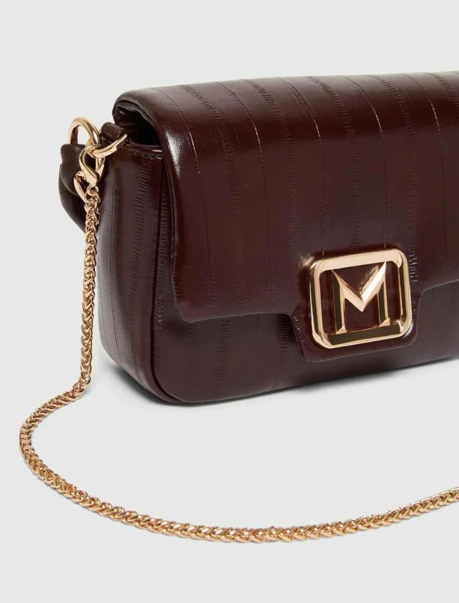 Borsa Le Muse small in tessuto spalmanto con stampa rettile, manico intrecciato con catena, portata a cross body e tracolla rimovibile, chiusura con patta con calamita, colore testa di moro
