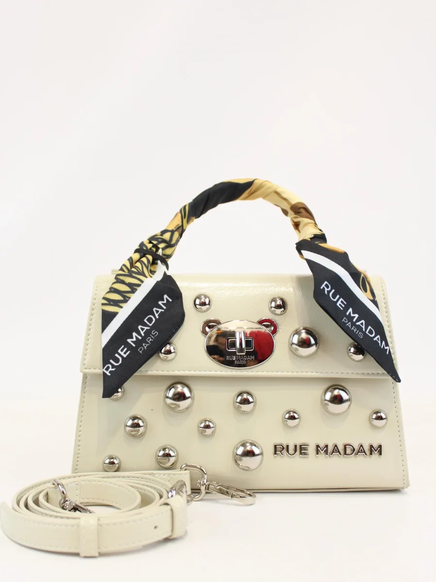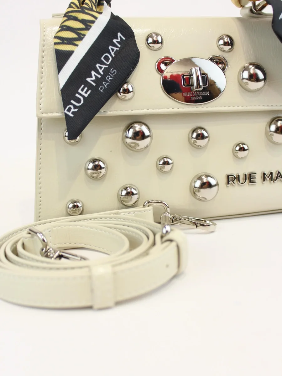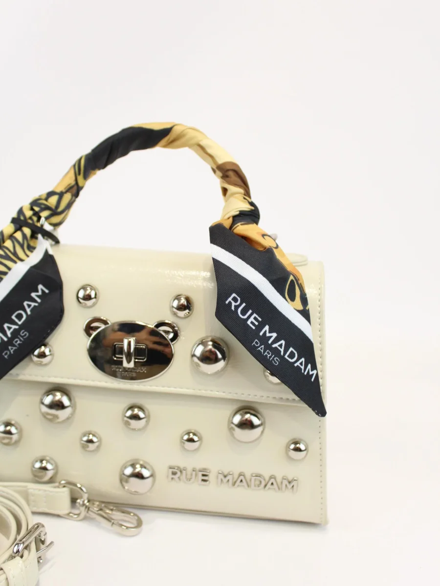 Borsa a mano mini teddy studs, realizzata in ecopelle effetto vernice, manici ricoperti in tessuto stampato, tracolla amovibile, tasche interne di cui una con zip, chiusura a girello e applicazione borchie, colore bianco