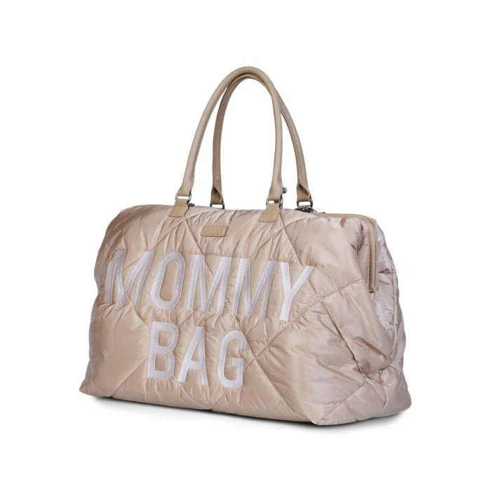Mommy bag trapuntata beige con logo in contrasto. scompartimento ampio interno, multi tasche interne, apertura con cerniera, tasca interna isotermica, tracolla per il trasporto e spazio per il bagaglio sul trolley, colore beige
