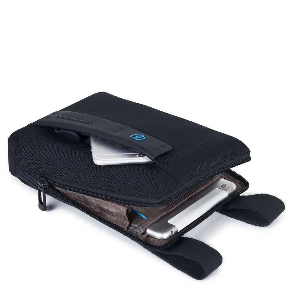 Borsello organizzato con scomparto porta Ipad mini, tracolla cucita, decorazione senza logo, chiusura singola con lampo, organizzazione interna fissa, tasca porta cellulare interna, porta penne