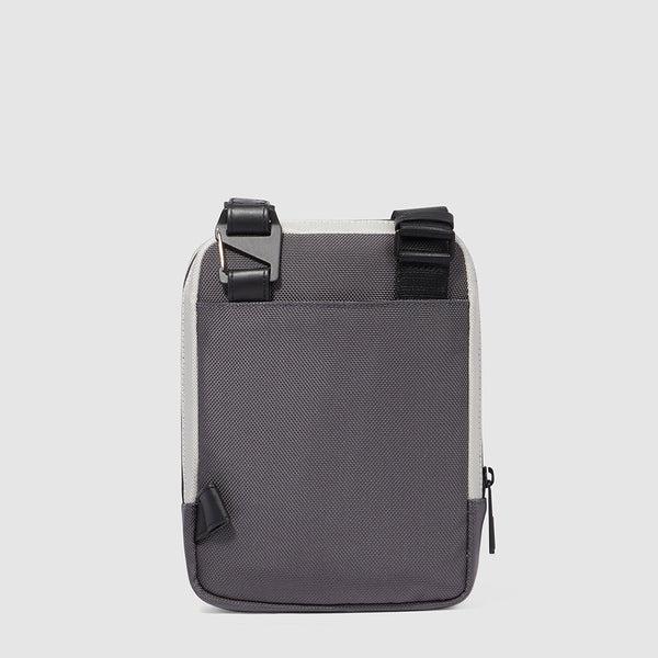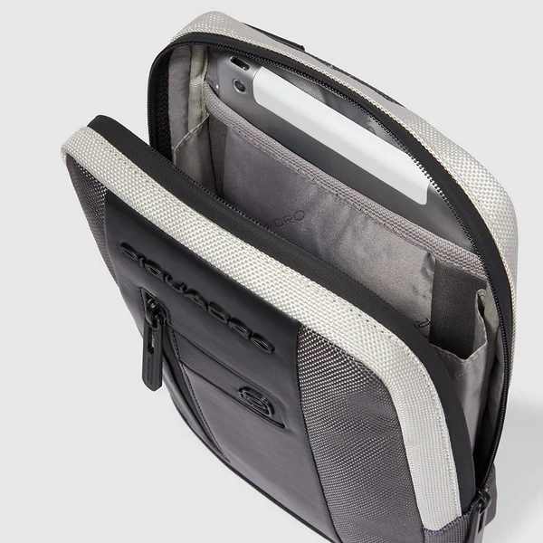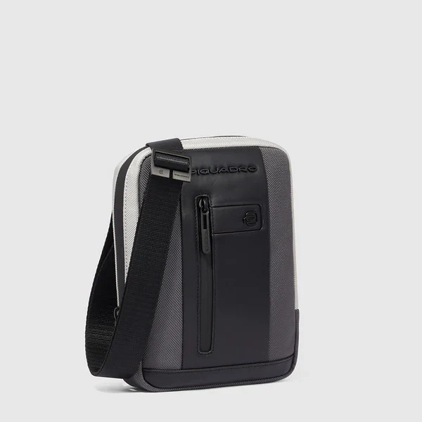 Borsello a tracolla linea urban Piquadro realizzato in tessuto riciclato e inserti in pelle, protezione anti frode RFID, scompartimento porta Ipad e tasca per air pods