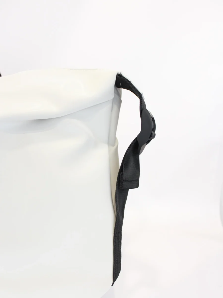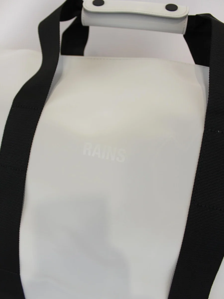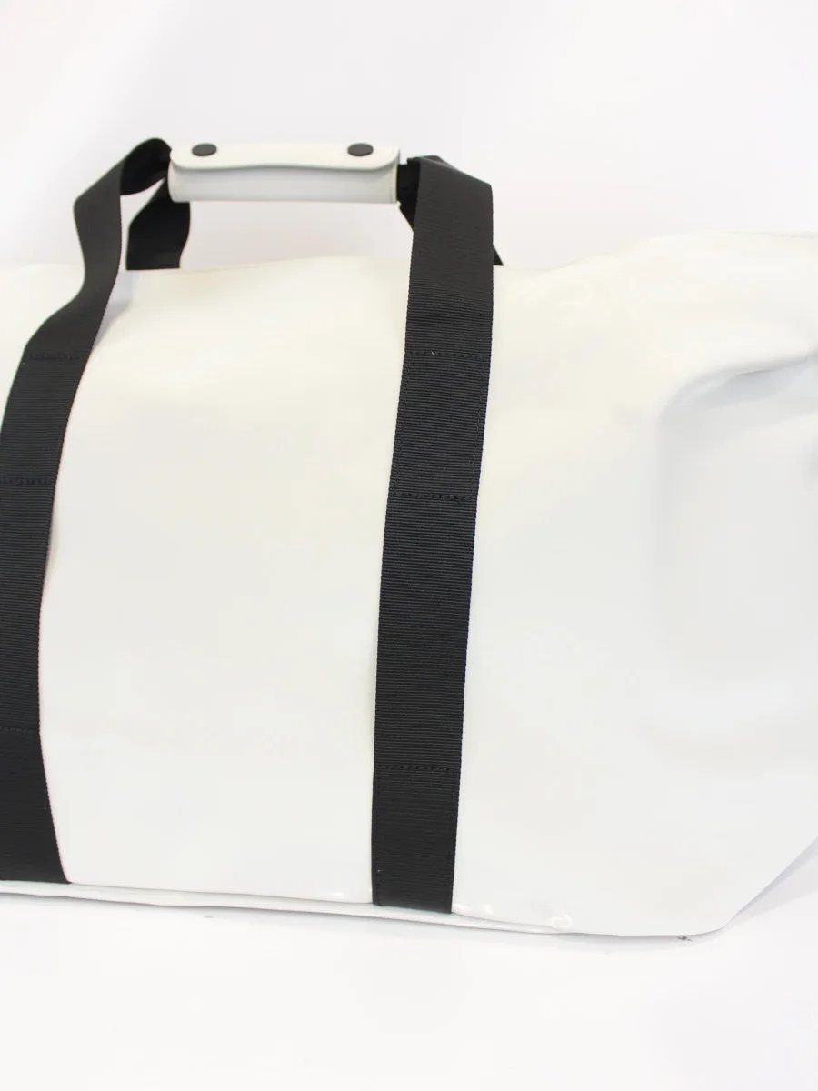 Borsone Hilo Weekend Bag, realizzato nel caratteristico tessuto impermeabile Rains, chiusura con cerniera rivestita, scomparto principale, cinghie di compressione laterali, spallaccio rinforzato regolabile e rimovibile, manici a cinghia con impugnatura, colore bianco