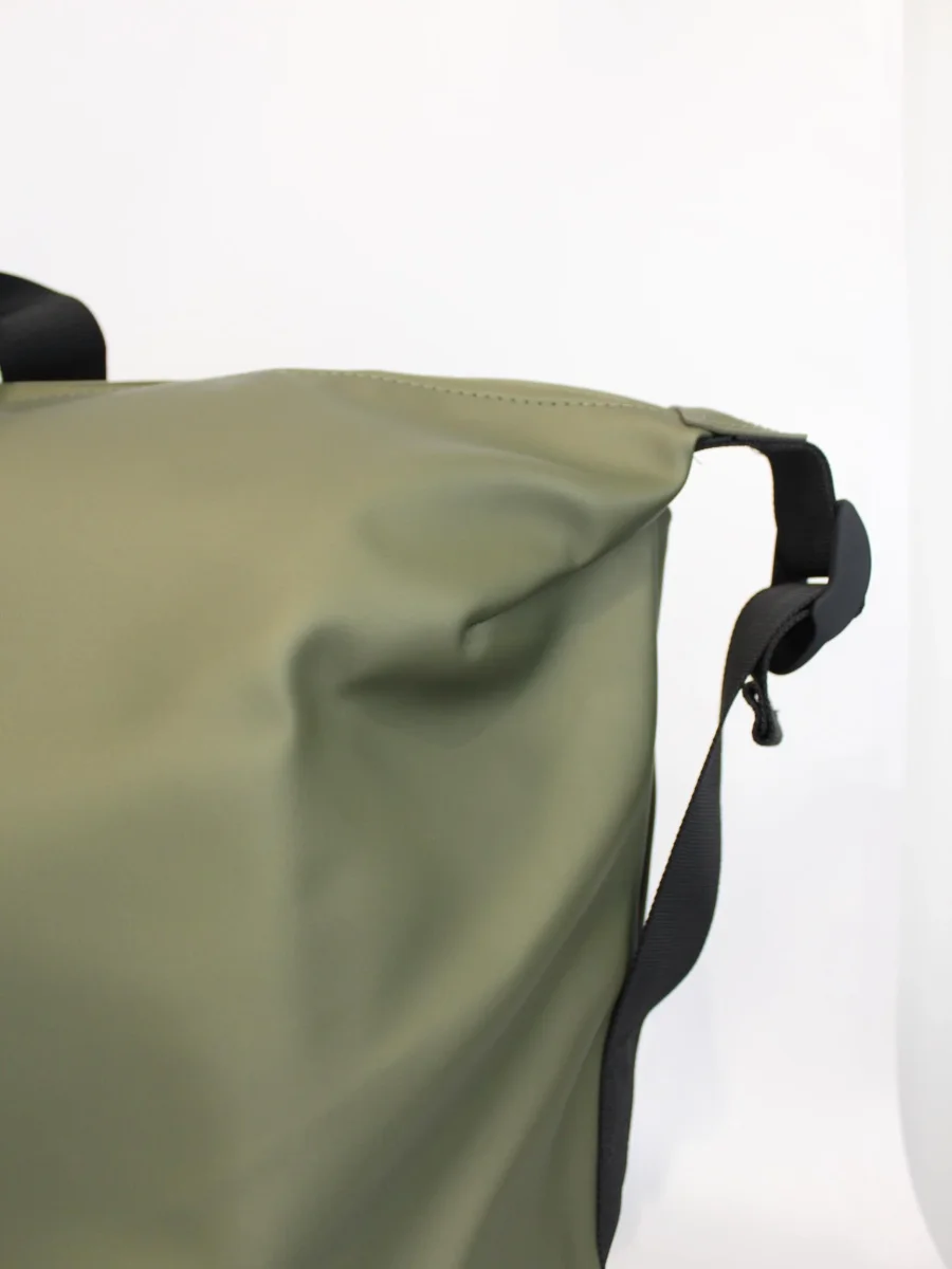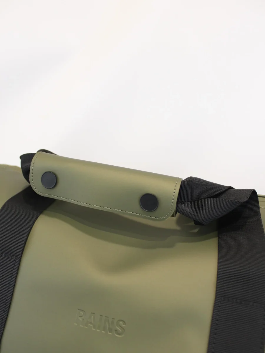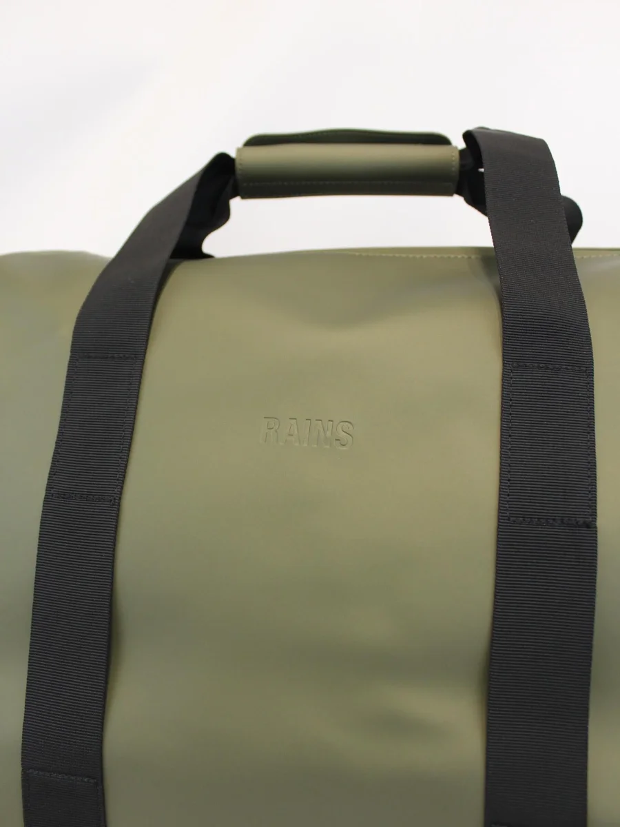 Borsone Hilo Weekend Bag, realizzato nel caratteristico tessuto impermeabile Rains, chiusura con cerniera rivestita, scomparto principale, cinghie di compressione laterali, spallaccio rinforzato regolabile e rimovibile, manici a cinghia con impugnatura, colore verde