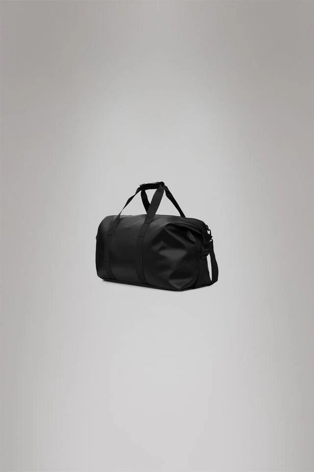 Borsone Hilo Weekend Bag, realizzato nel caratteristico tessuto impermeabile Rains, chiusura con cerniera rivestita, scomparto principale, cinghie di compressione laterali, spallaccio rinforzato regolabile e rimovibile, manici a cinghia con impugnatura, colore nero