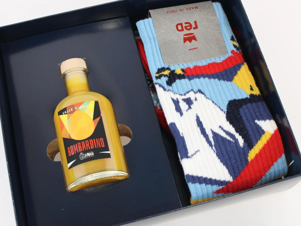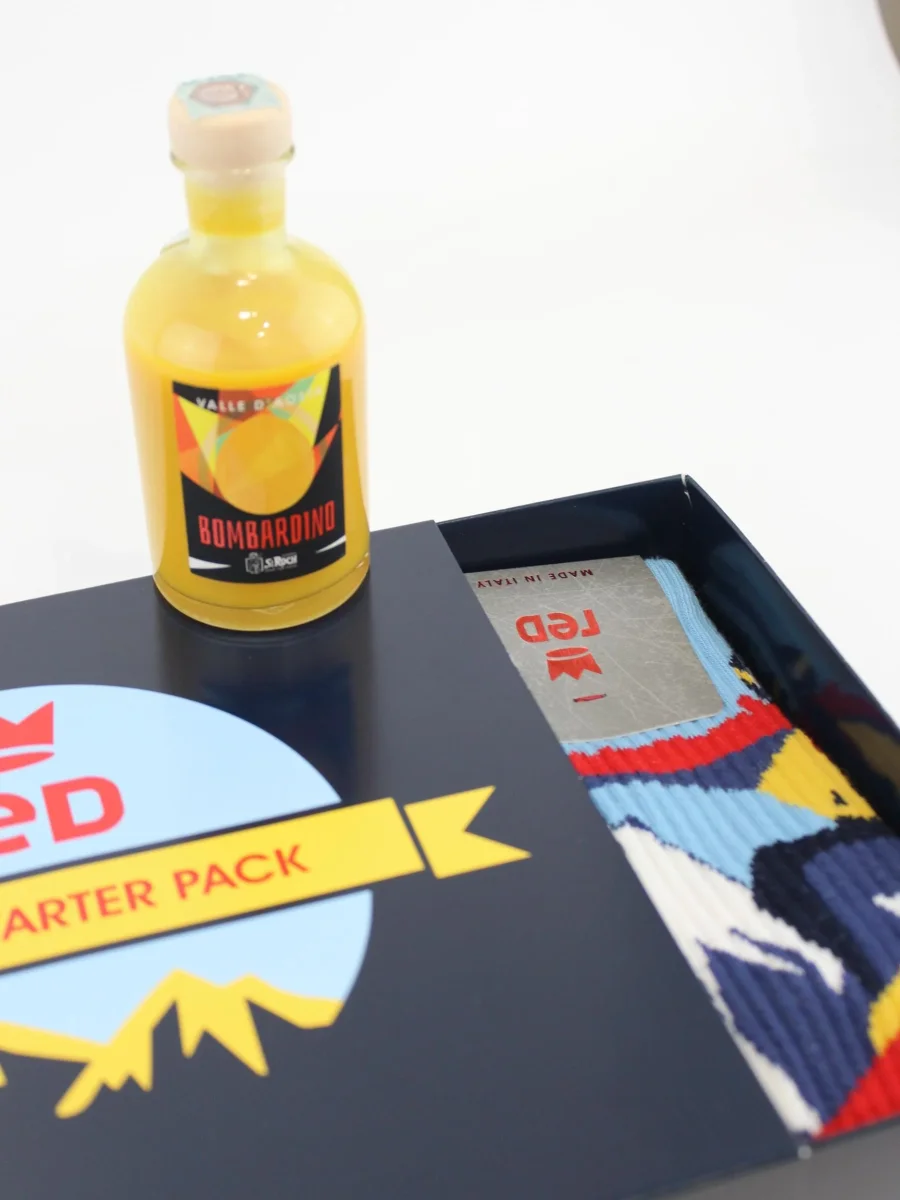 Kit regalo Red uomo, modello con calza in cotone multicolor in contrasto, e bottiglietta bombardino. Perfetto per un regalo