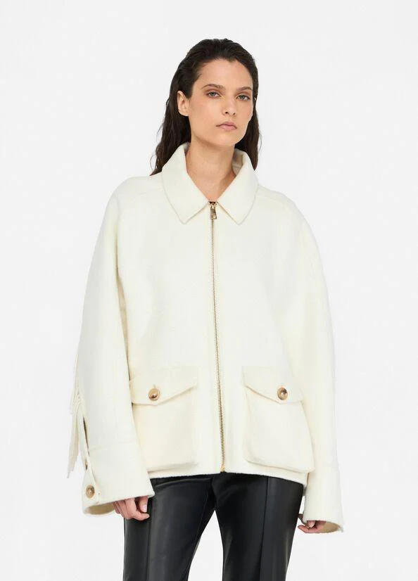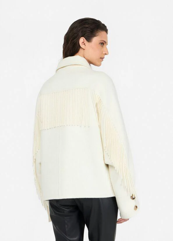 Caban in panno di misto lana Liu Jo, frange sul retro, collo a camicia, polsi con bottoni, tasche con patta e bottone, chiusura con zip e fodera interna, colore bianco