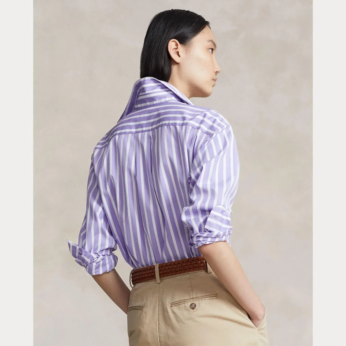 Camicia donna Ralph Lauren, collo a punta, chiusura con bottoncini, fantatia a righe bicolor, realizzata in cotone. Colore lilla