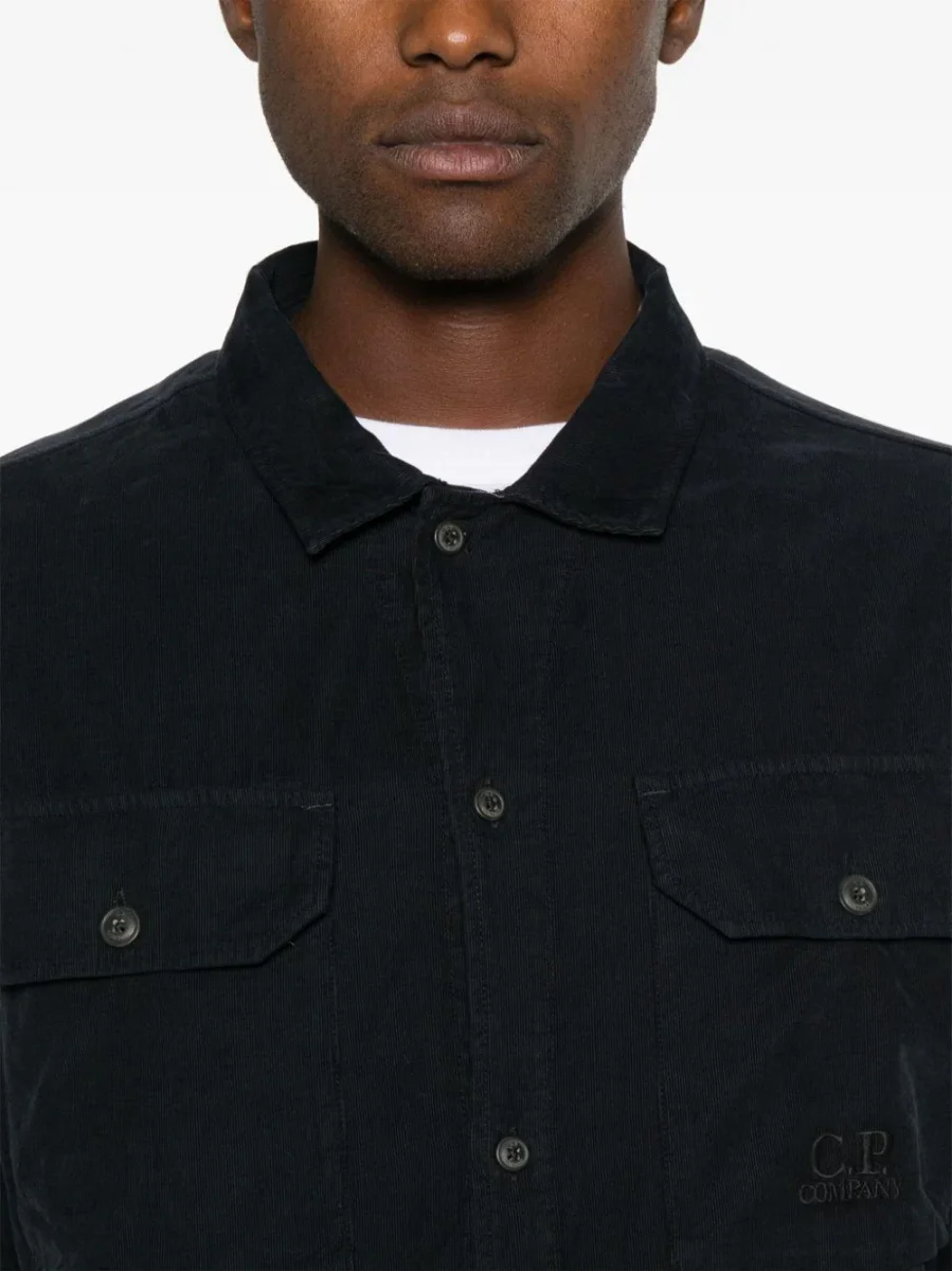 Camicia in velluto CP Company uomo, colletto classico, chiusura con bottoni, tasche sul petto con bottoni e logo ricamato in tono, tasche laterali, vestibilità regular, colore blu