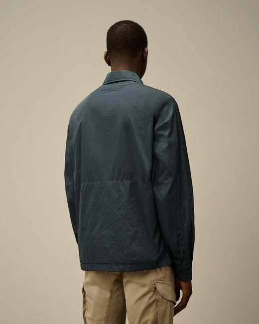 Overshirt uomo con bottoni, realizzato in nylon chrome r, colletto classico, chiusura con bottoni, tasche frontali applicate con bottoni, tasche laterali con patta e bottone automatico, taschino con lente, colore inchiostro, vestibilità regular