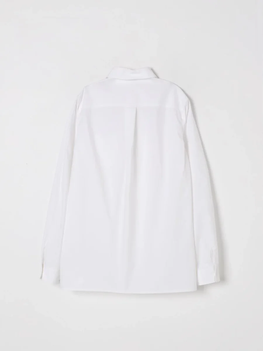 Camicia logata Pinko, chiusura con bottoni, maniche lunghe, logo in contrasto sul petto. Colore bianco
