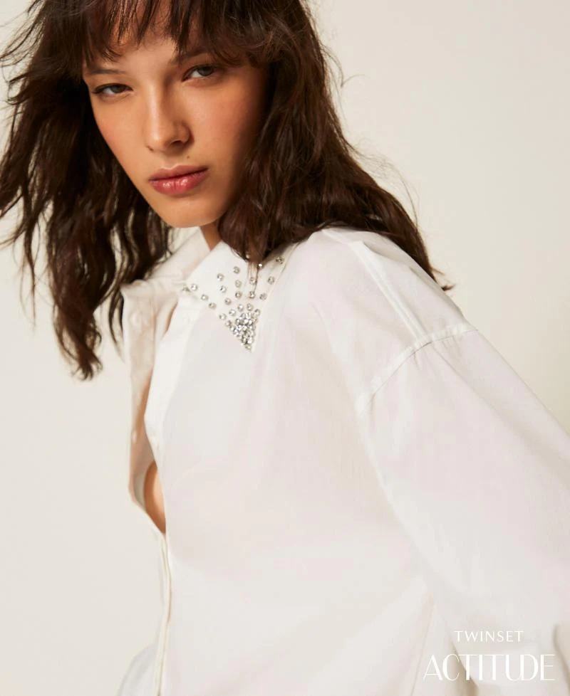 Camicia Twinset Actitude modello in popeline di cotone stretch con colletto decorato da strass in degrade ricamati a mano, chiusura con bottoni, bottone gioiello, colore bianco