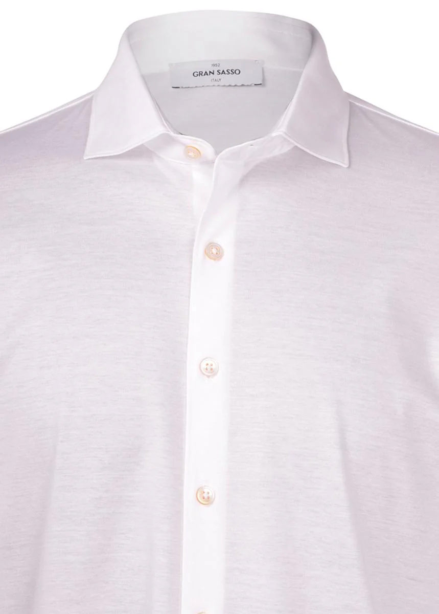 Camicia in jersey di cotone filo di scozia con fondo arrotondato, realizzata in tessuto lucente e morbido effetto seta, colletto alla francese, colore bianco