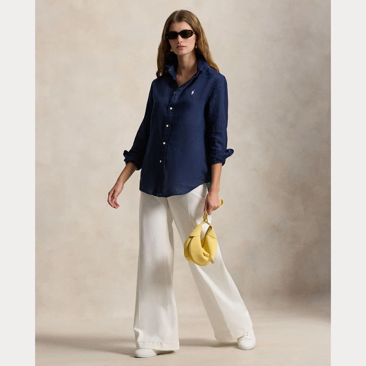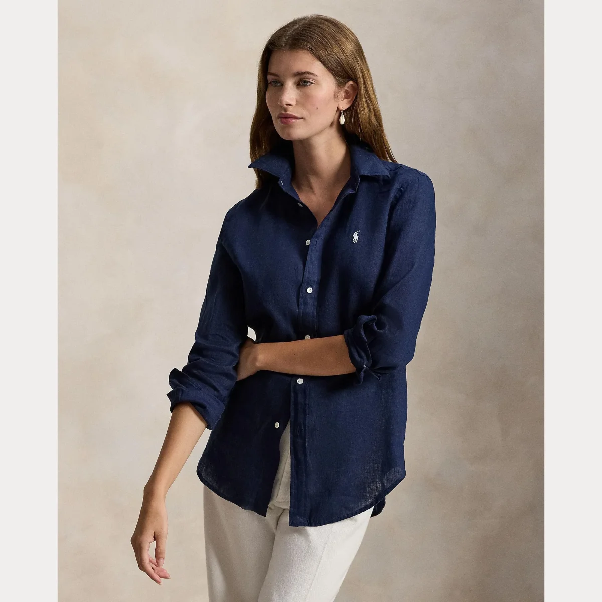 Camicia realizzata in lino leggero Ralph Lauren Polo, chiusura con bottoni a conchiglia e iconico logo ricamato in contrasto sul petto, colore blu