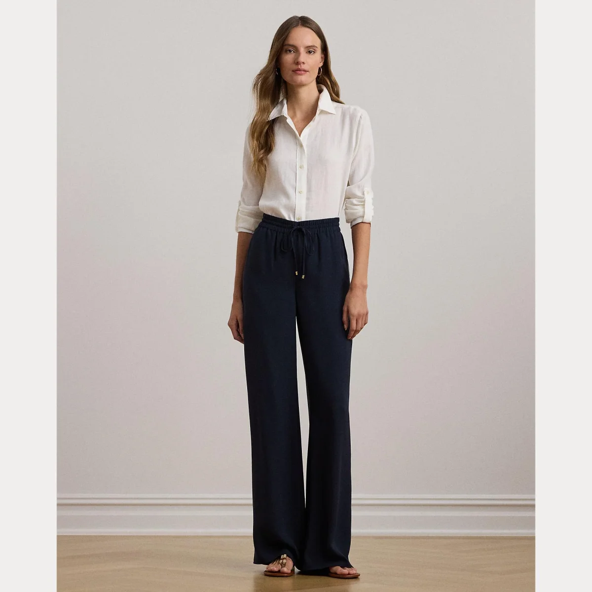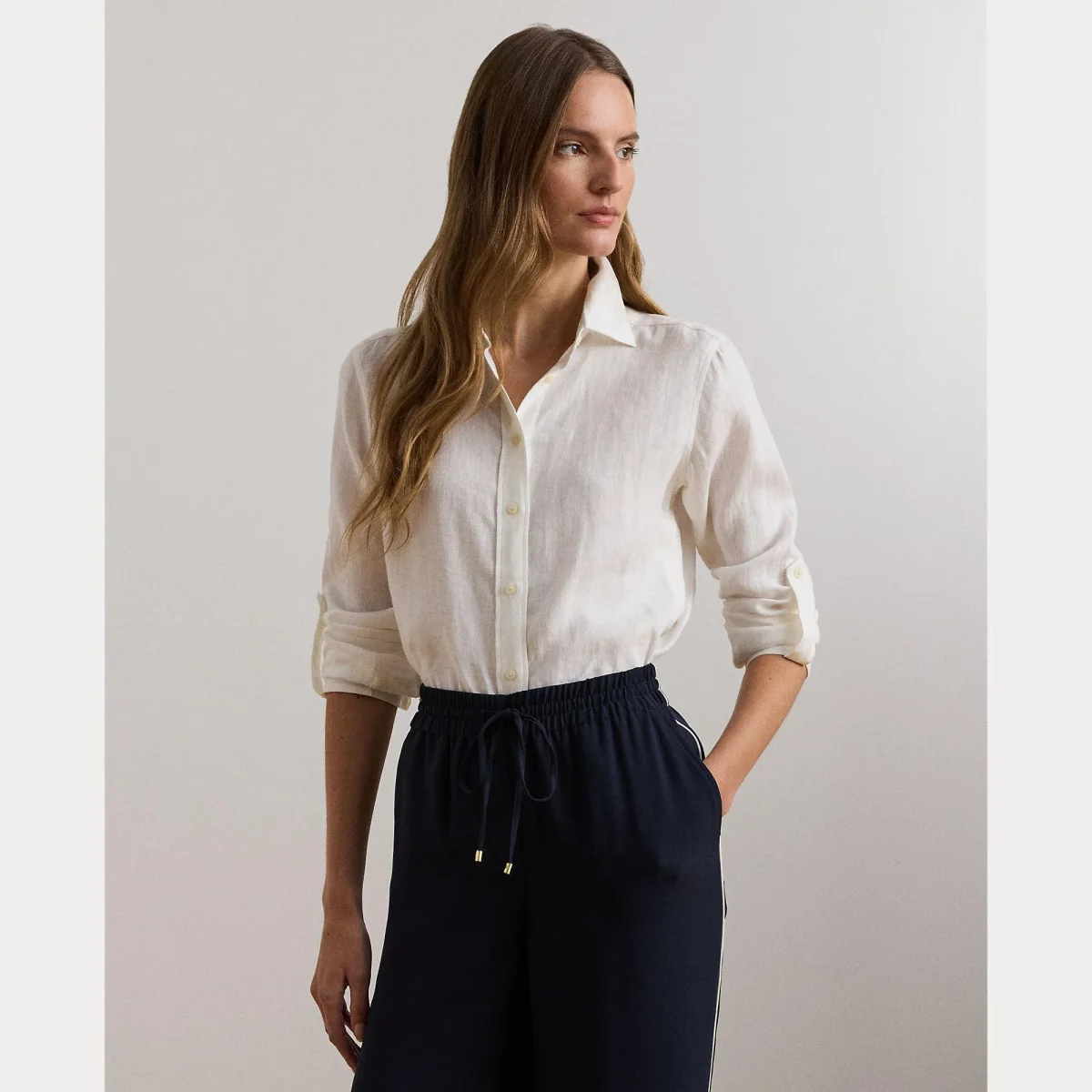 Camicia in lino relaxed fit Lauren di Ralph Lauren, colletto a punta, abbottonatura con bottoni incisi, maniche lunghe con linguetta arrotolabile e polsini a botte con bottoni, colore bianco