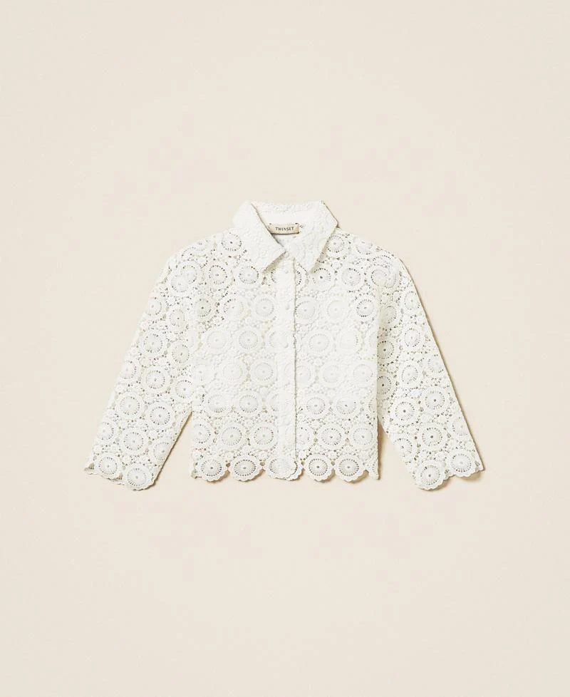 Camicia Twinset Girl, modello in pizzo macramè a motivo geometrico, maniche lunghe con polsino e bottone, chiusura bottoni, fondo smerlato, top rimovibile, colore bianco