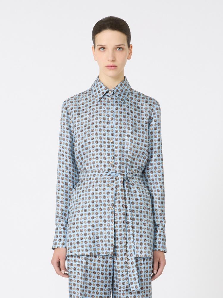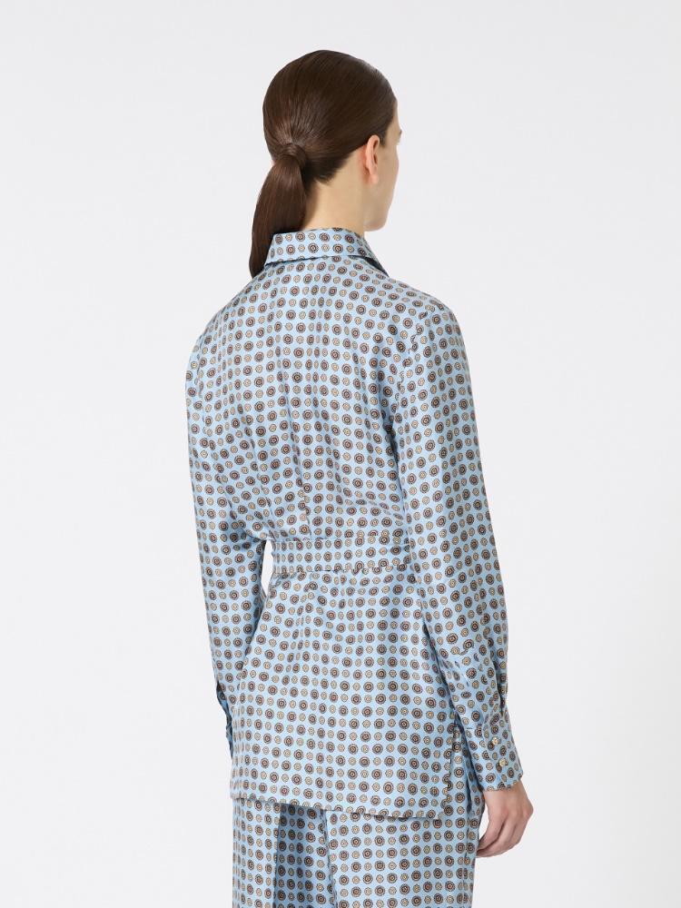 Camicia in twill di pura seta stampata, collo a punta, maniche lunghe a giro con polsino e bottone laterale, chiusura frontale con bottoni gioiello, colore azzurro