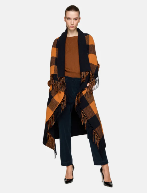 Cappa Dondup donna, modello smanicato con logo jacquard verticale e frange sul fondo, lana check, color blu