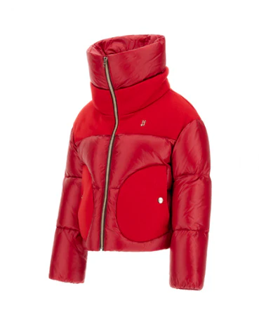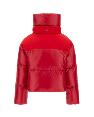 Giubbino realizzato nell’iconico nylon ultralight, vestibilità regolare, imbottitura in piuma, collo alto, tasche laterali con bottone a pressione, logo in metallo sul petto, chiusura con zip, colore rosso