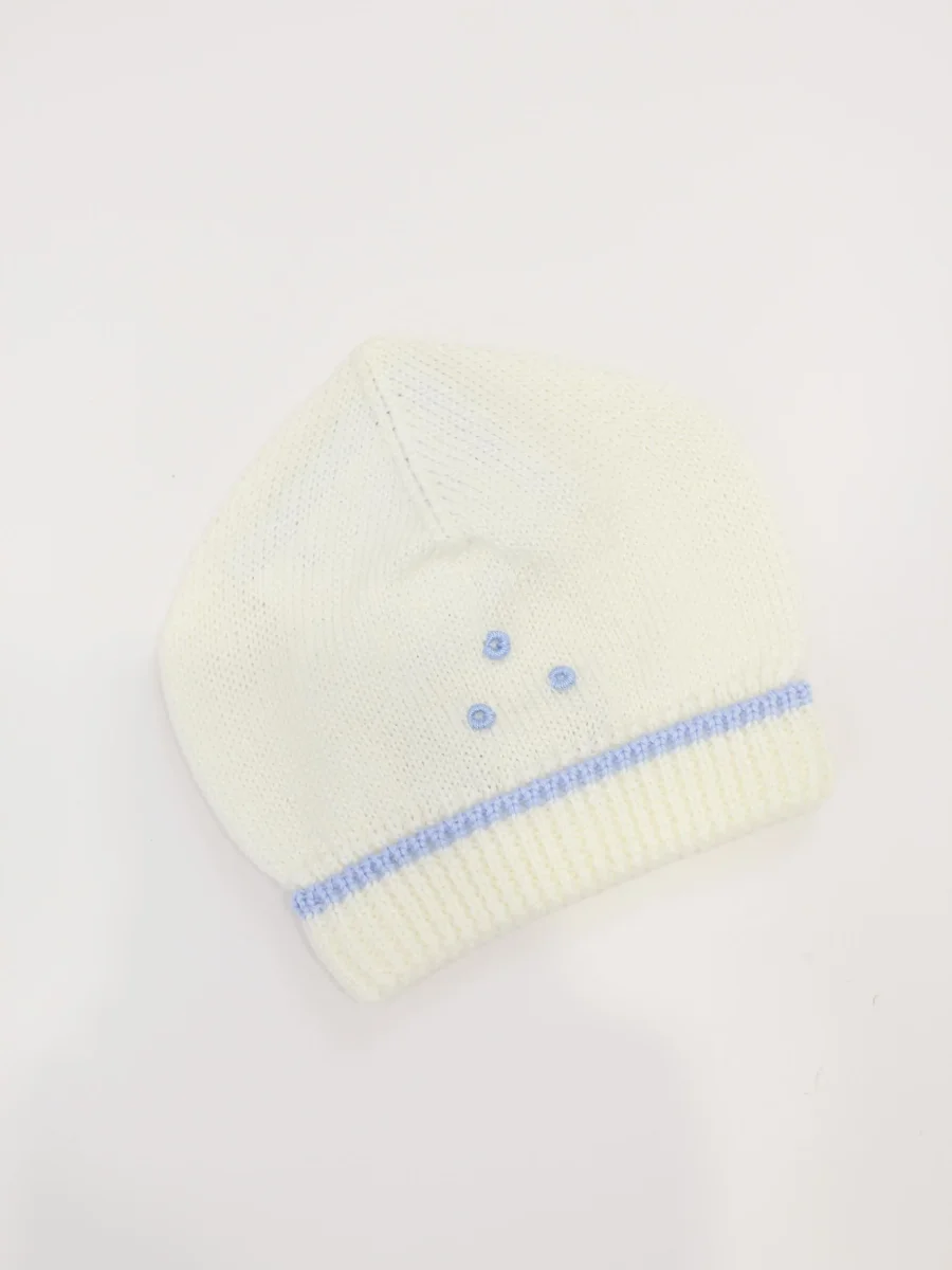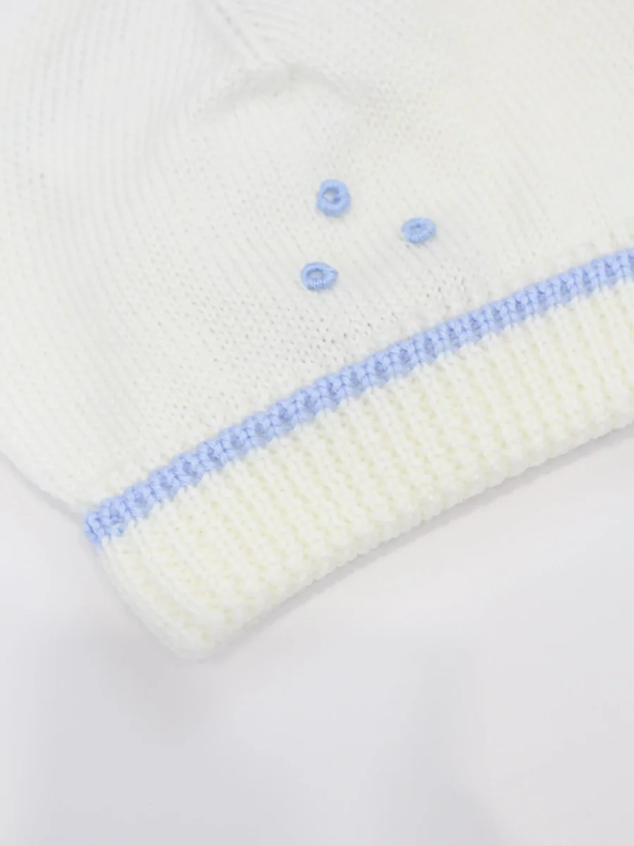 Cappellino nascita Piccola Giuggiola, 100% lana merino, ricami realizzati a mano ed in contrasto. Colore avorio