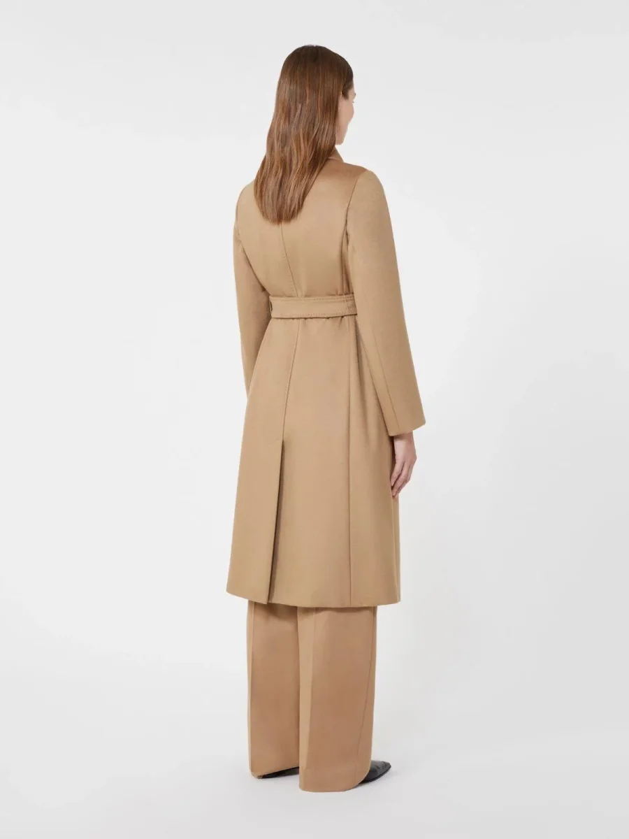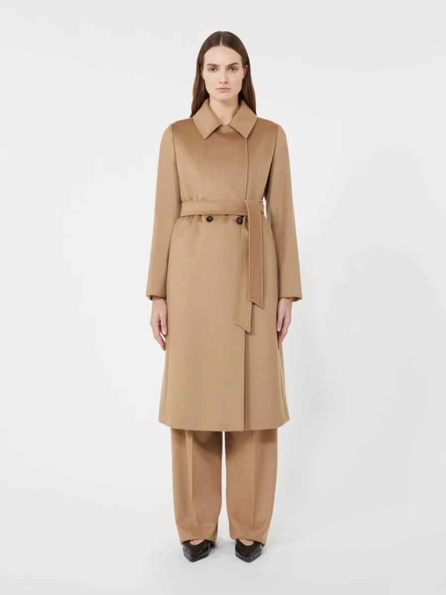 Cappotto lungo Max Mara, modello in drap di pura lana, colletto con rever aperto o chiuso con bottone, maniche lunghe, chiusura con cintura abbinata e bottoni a vista, color cammello