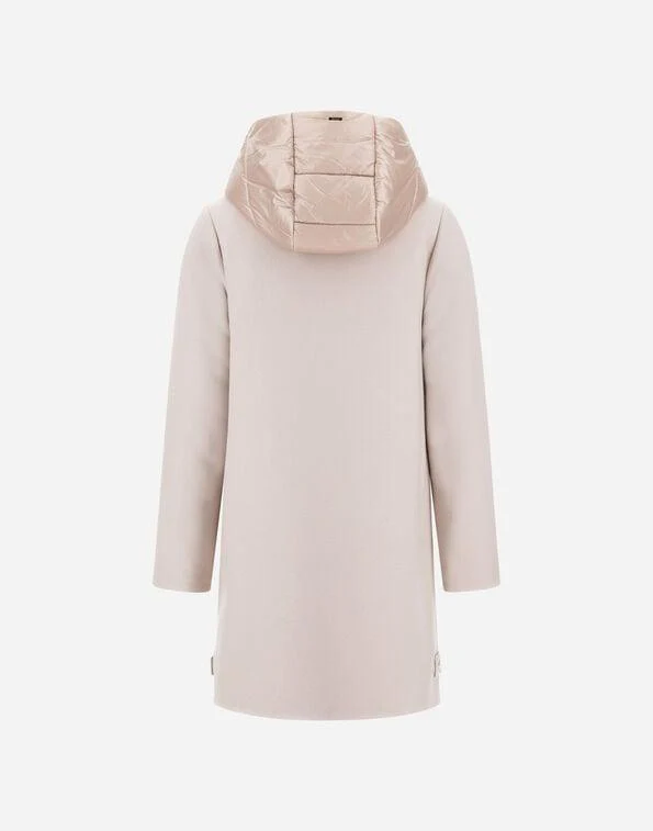 Cappotto realizzato in twill di lana vergine, vestibilità regolare, imbottitura in ovatta, collo alto, cappuccio rimovibile, tasche con bottone a pressione, logo in metallo sul petto, chiusura a doppio cursore, colore rosa