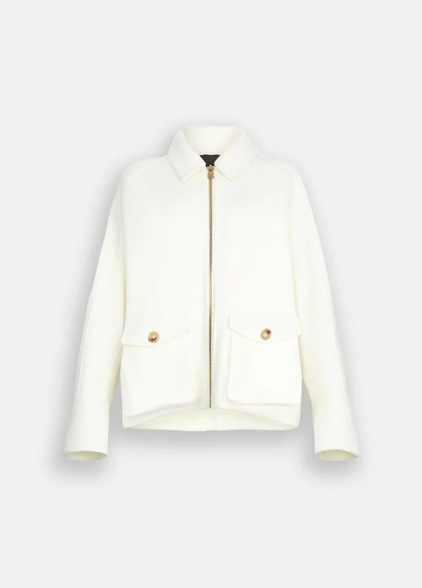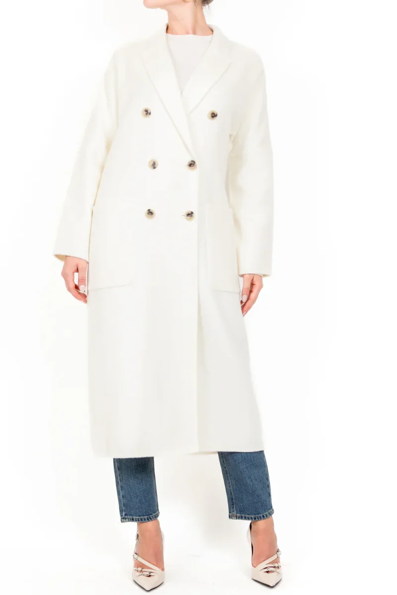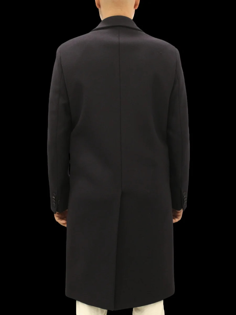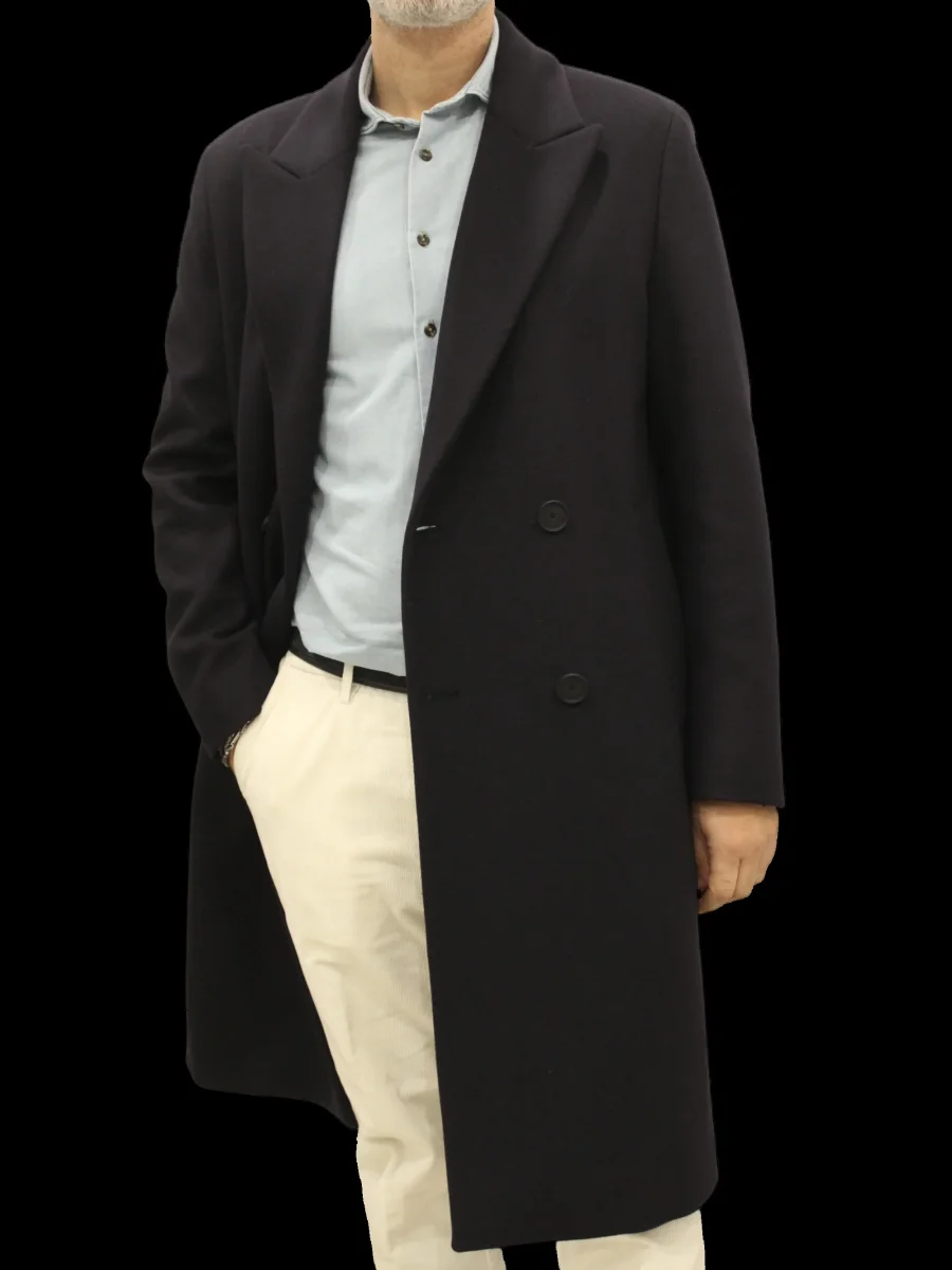 Cappotto doppiopetto foderato relaxed fit, rever a lancia, chiusura quattro bottoni, due tasche frontali, spacco centrale sul retro, quattro bottoni ai polsi. Panno misto lana, colore blu