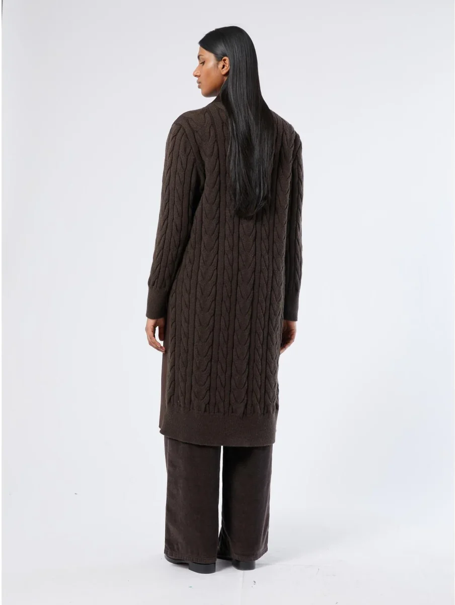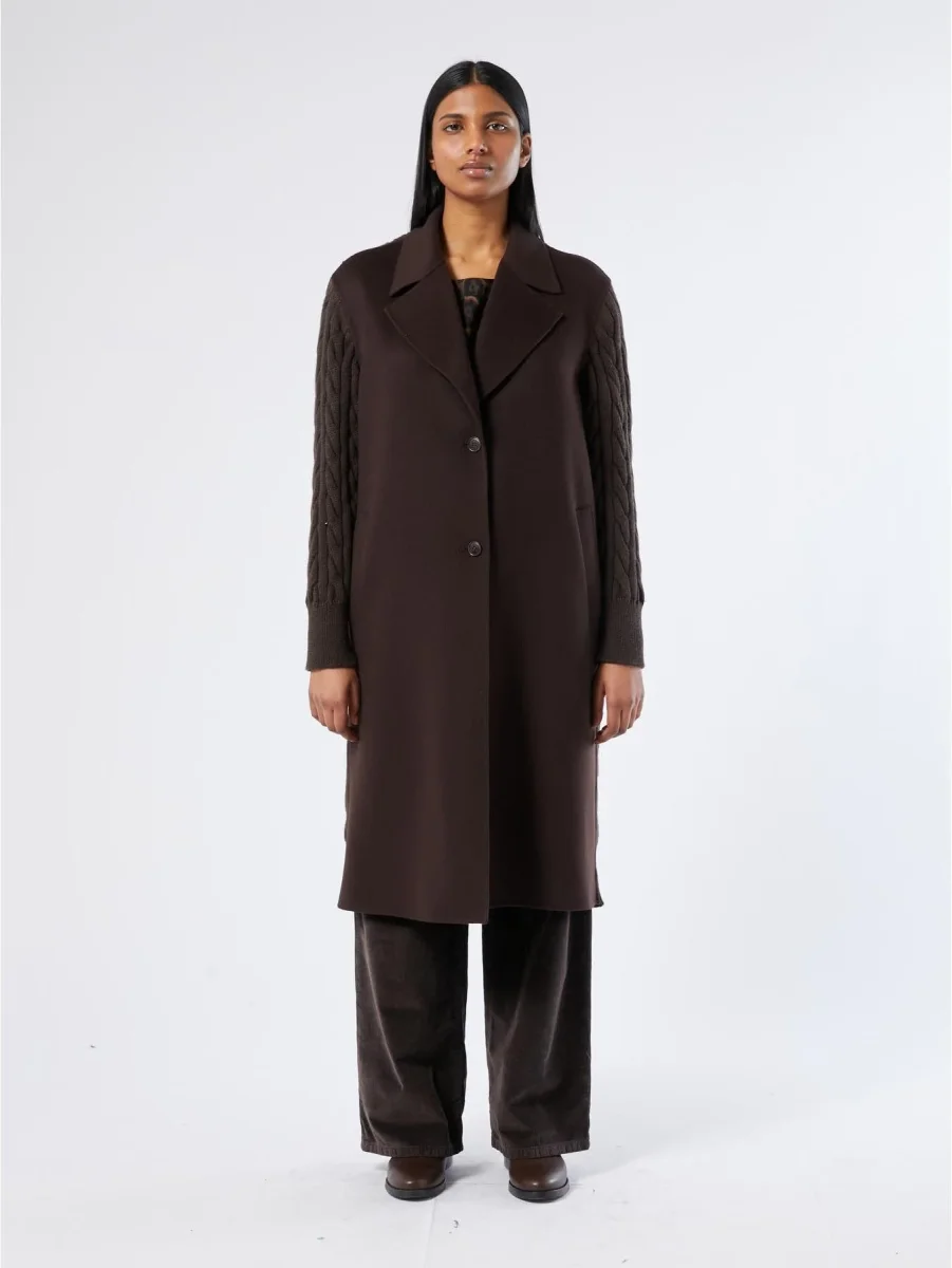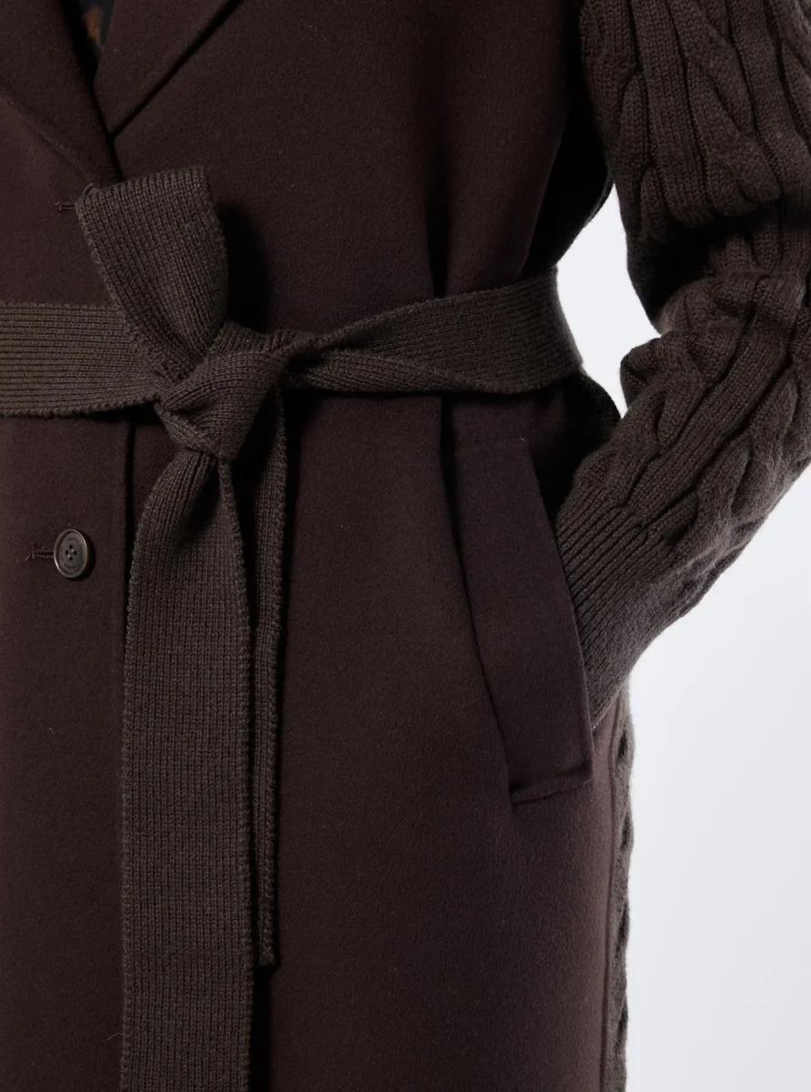 Cappotto in double di misto lana e maglia a trecce, collo con revers, maniche lunghe, chiusura con bottoni a vista, tasche a filettone, cintura abbinata in maglia, colore marrone