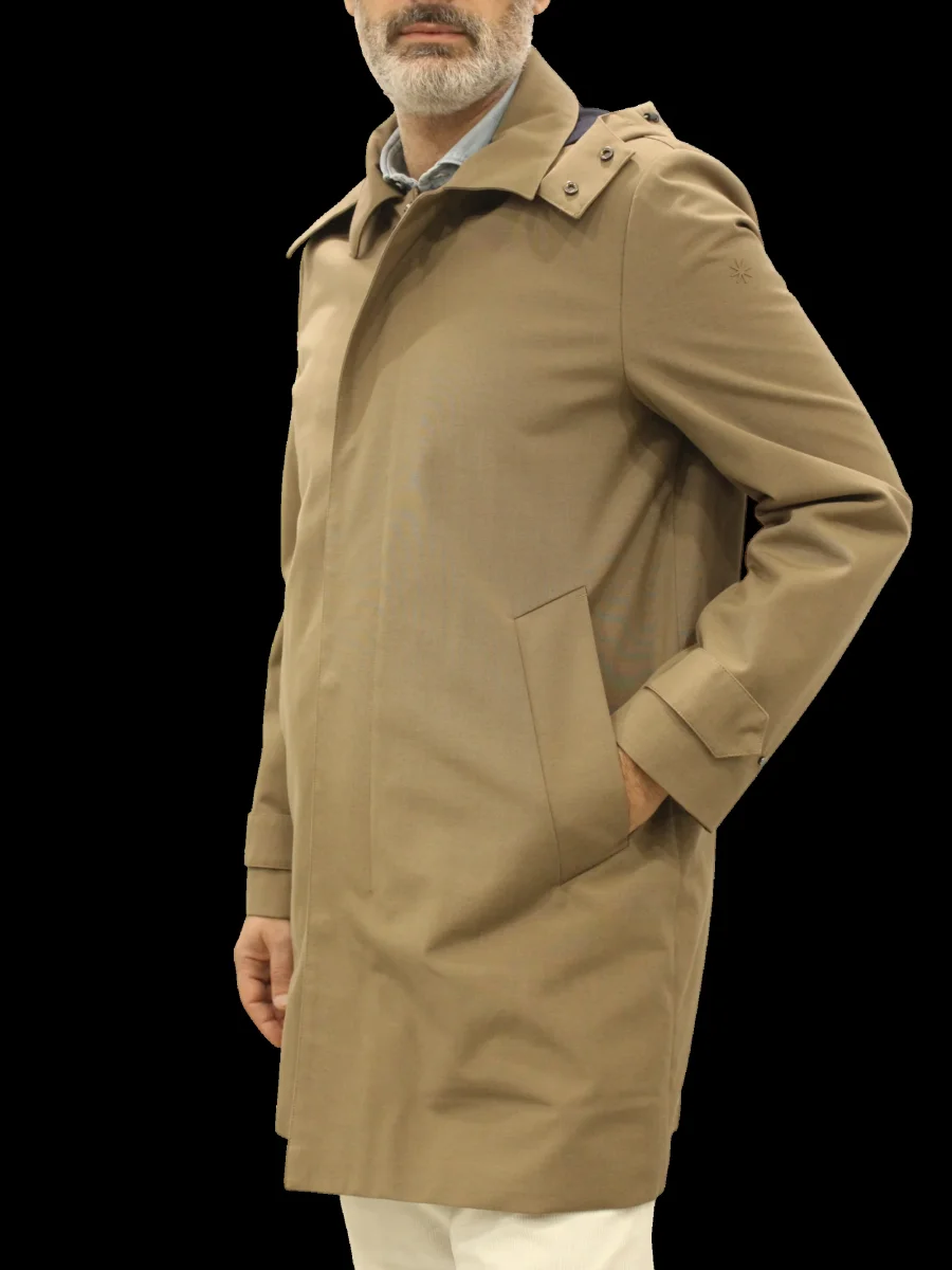 Cappotto lungo Manuel Ritz, vestibilità regolare, cerniera e bottoni sul davanti, cappuccio removibile, tasche laterali anteriori e tasche interne, colore cammello